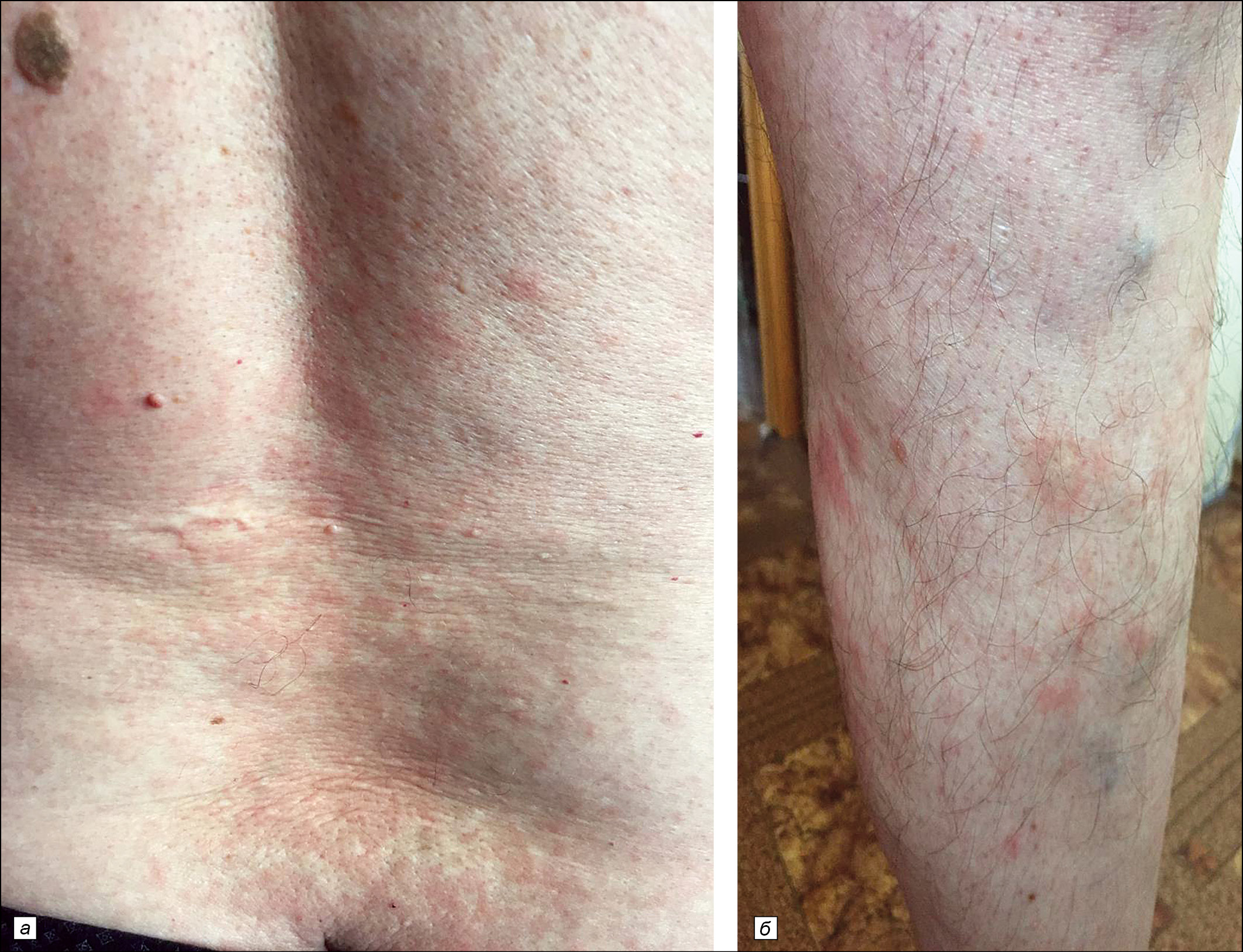 Рис. 20. Полиморфные высыпания на коже шеи, верхней трети спины и нижних конечностей у 65-летнего пациента с COVID-19. а – папулёзная сыпь на коже спины; б – волдыри на коже голени.