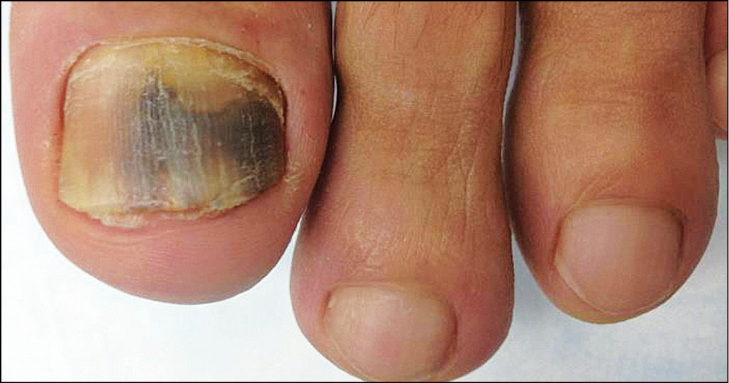 Рис. 1. Больной К., 32 года. Руброфития ногтей. Подногтевая гематома. Симптомы: меланонихия, онихолизис, желтовато- серый цвет.