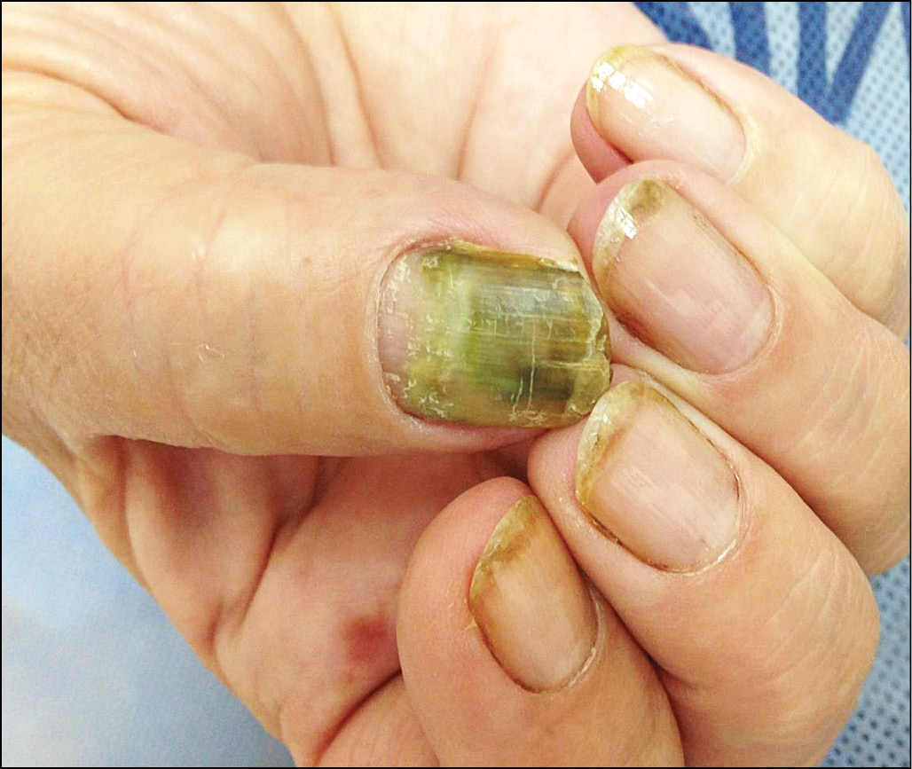Рис. 5. Больная Н., 63 года. Псевдомонадная ониходистрофия. Симптомы: онихолизис, появление зеленоватого цвета.