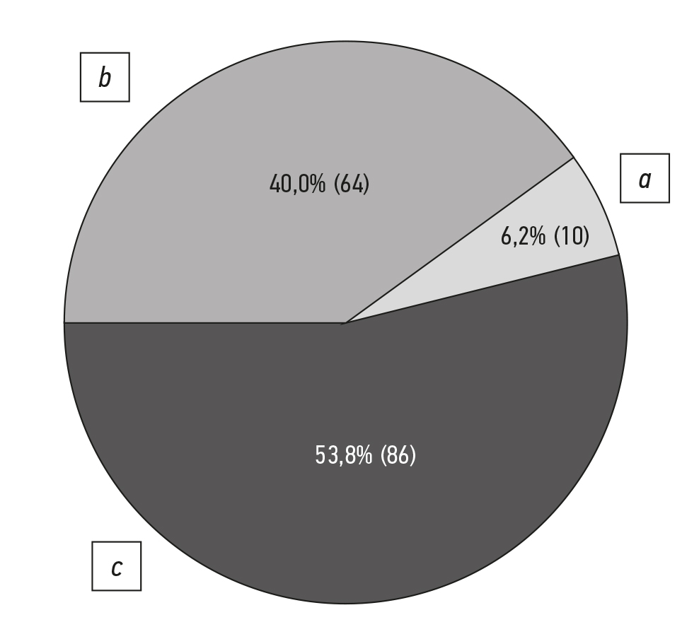 Рис. 2. Распределение пациентов по степени тяжести псориаза: a ― псориаз лёгкой степени тяжести; b ― псориаз средней степени тяжести; c ― псориаз тяжёлой степени.