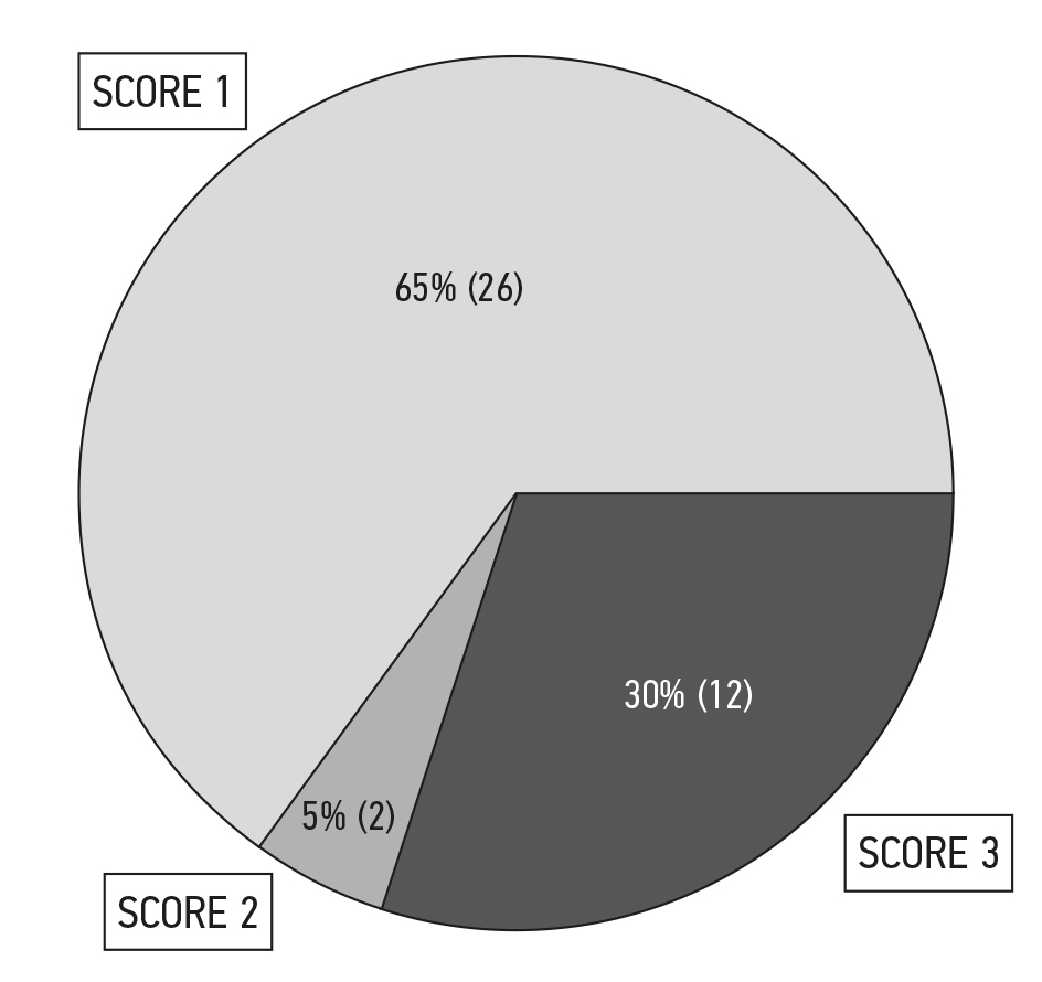 Рис. 3. Сердечно-сосудистый риск у пациентов с псориазом: SCORE 1 ― низкий сердечно-сосудистый риск; SCORE 2 ― средний сердечно-сосудистый риск; SCORE 3 ― высокий сердечно-сосудистый риск.
