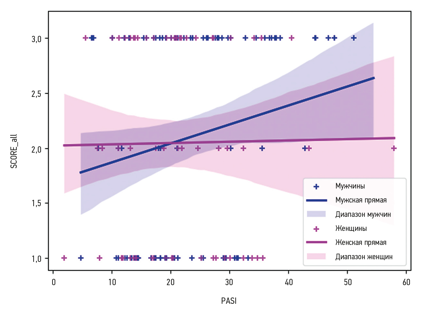 По данным корреляционного анализа с помощью критериев Пирсона и Спирмена выявлена средняя линейная прямая зависимость между степенью тяжести псориаза и ССЗ, коэффициент корреляции составил 0,14 (р <0,05), что свидетельствует о незначительном влиянии PASI на ССР. При анализе мужской части выборки коэффициент корреляции оказался выше и составил 0,21 (р <0,05), женской ― 0,14 (р <0,05) соответственно. Несмотря на то, что на данном этапе сравнения не удалось достичь критериев статистической значимости, тем не менее можно говорить о тенденции увеличения ССР в зависимости от степени тяжести псориаза у мужской части выборки (рис. 5).