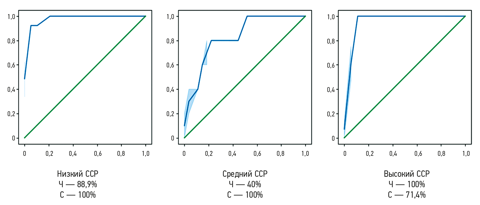 Рис. 6. ROC-кривые: по оси абсцисс ― показатель частоты ложных срабатываний, по оси ординат ― истинный положительный показатель. ССР ― сердечно-сосудистый риск; Ч ― чувствительность; С ― специфичность.