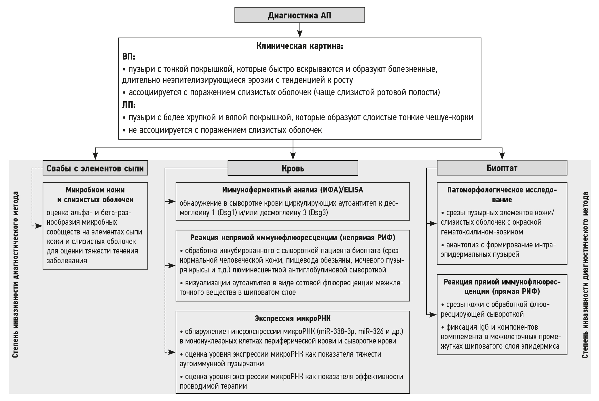 В настоящее время стандартом диагностики аутоиммунной пузырчатки являются выявление характерной клинической картины, гистологическое исследование, а также проведение прямой и непрямой иммунофлюоресценции (РИФ) и/или иммуноферментного анализа (ИФА; enzyme-linked immunosorbent assays, ELISA); рис. 1 [11].