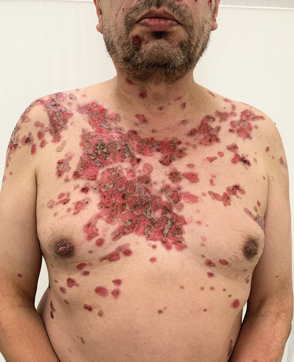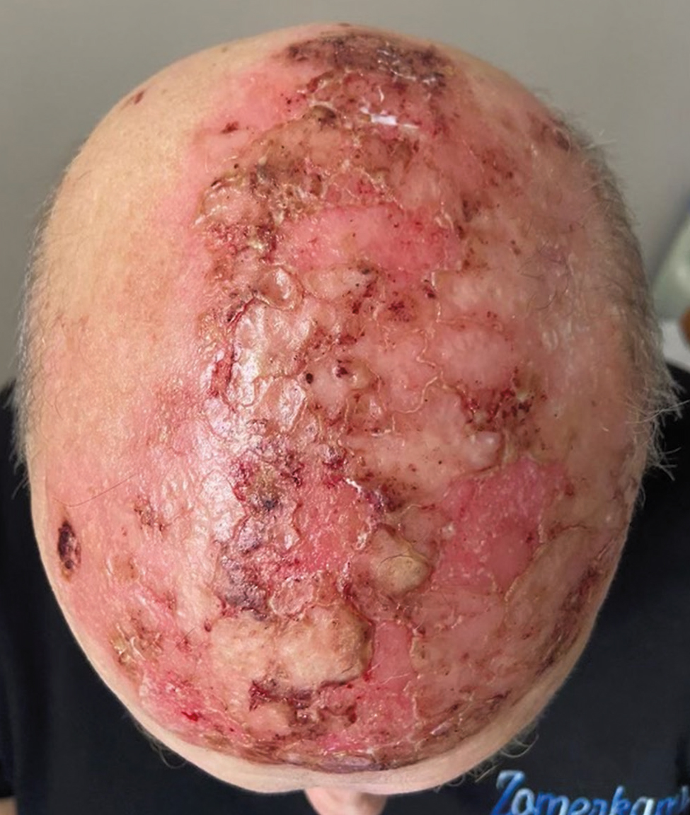 Рис. 3. Клиническая картина листовидной пузырчатки: эрозии, покрытые тонкими слоистыми чешуе-корками.