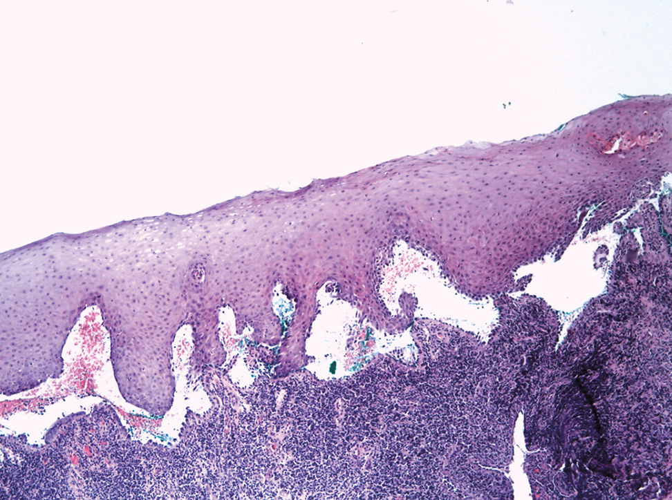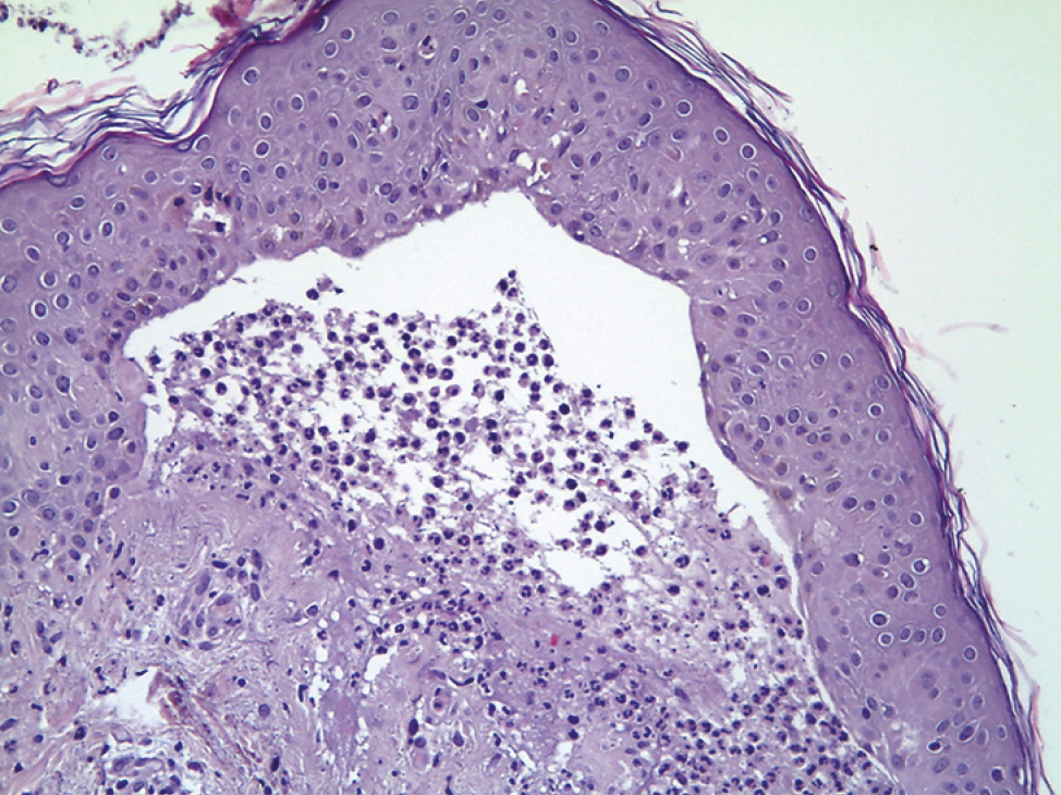 Рис. 4. Гистологическая картина вульгарной пузырчатки: акантолиз на уровне шиповатого слоя, приведший к образованию внутриэпидермального пузыря.