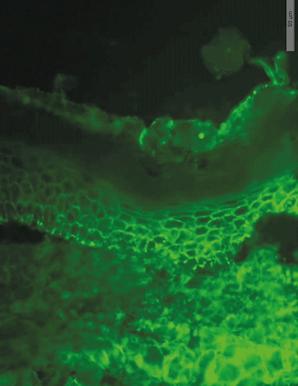 Лабораторные методы диагностики аутоиммунной пузырчатки разнообразны и на сегодняшний день включают патоморфологический метод, ИФА (ELISA), прямую РИФ, непрямую РИФ (тест-система BioChip), а также иммуноблоттинг [26, 27]. Золотым стандартом диагностики аутоиммунной пузырчатки является исследование биоптата с помощью прямой РИФ для визуализации межклеточного отложения иммуноглобулина G (IgG) и/или регулятора системы комплемента C3 в эпидермисе, а также патоморфологическое исследование биоптата кожи из области на границе пузыря и здоровой кожи [16, 28]. Однако, несмотря на общепризнанность данных методов, нельзя исключить получение ложнонегативных результатов исследования [29–31].