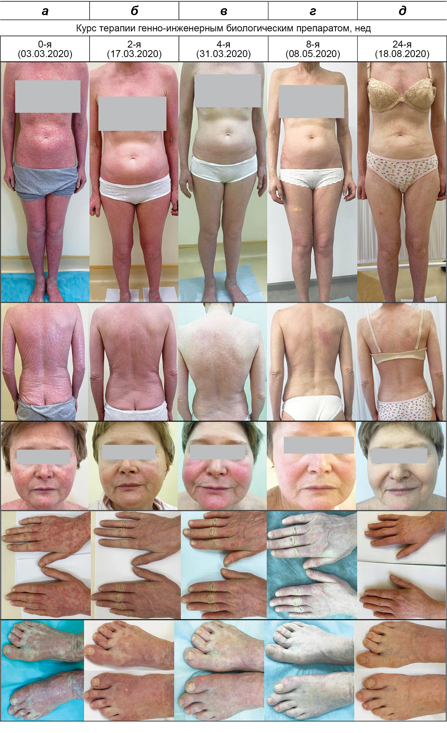 Учитывая клиническую картину, анамнестические данные, развитие гематологической токсичности от цитостатической терапии (метотрексата), длительное неэффективное лечение системными ГКС с развитием побочных эффектов, данные обследования и консультаций специалистов, пациентке назначено лечение ГИБП ТАЛС (иксекизумаб) по следующей схеме: 160 мг в виде 2 подкожных инъекций по 80 мг в качестве начальной дозы на 0-й нед, далее по 80 мг в виде 1 подкожной инъекции на 2, 4, 6, 8, 10, 12-й нед, начиная с 16-й нед – по 80 мг в виде 1 подкожной инъекции 1 раз в 4 нед в качестве поддерживающей дозы. На фоне проводимого лечения отмечалась положительная динамика (рис. 1, б–д).