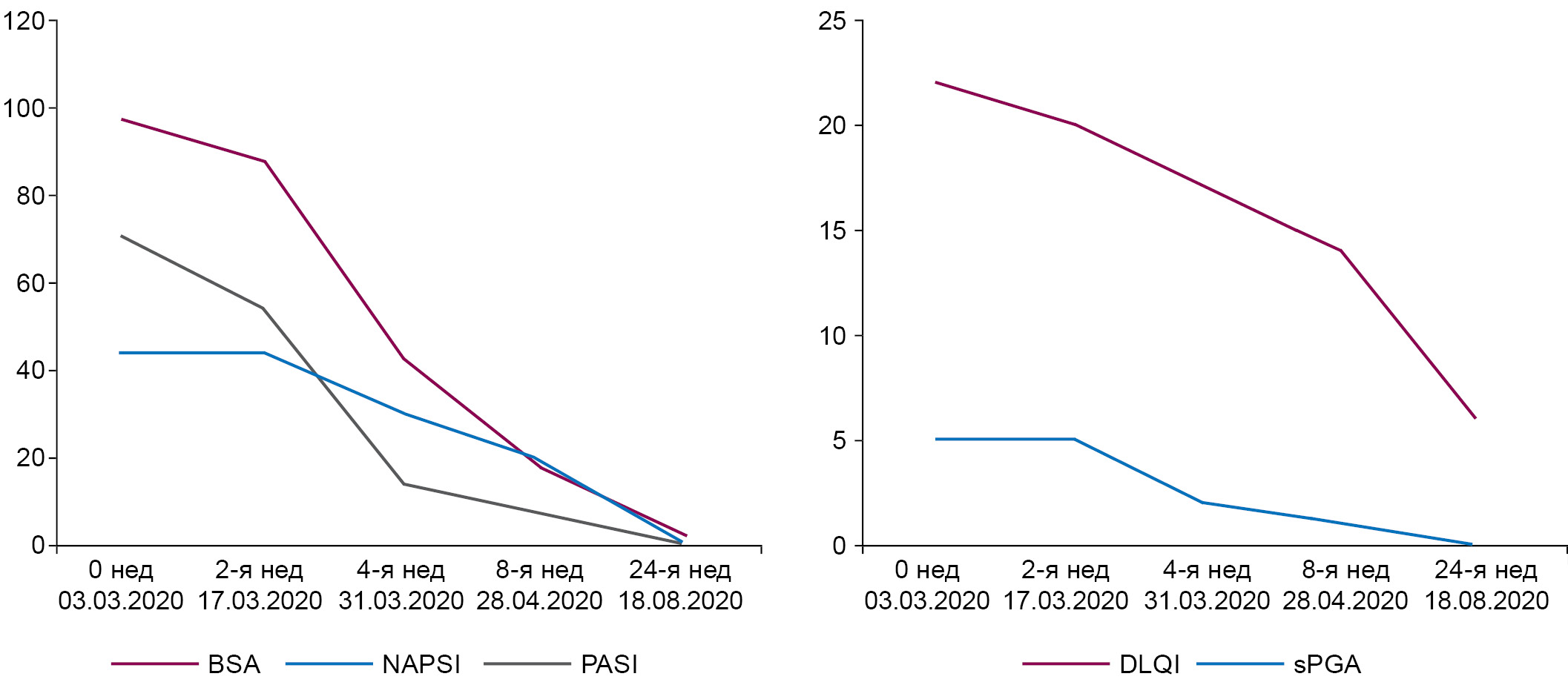Локальный статус от 18.08.2020 (24-я нед терапии иксекизумабом): кожный процесс с выраженной положительной динамикой: высыпания на коже волосистой части головы, лица, ушных раковин, туловища и верхних конечностей полностью разрешились, сохраняются незначительный ксероз и лёгкое шелушение кожи обеих голеней. Ногтевые пластины кистей и стоп не изменены. Отмечается деформация в области проксимального межфалангового сустава 2-го пальца правой стопы и дистальных межфаланговых 2-го и 3-го пальцев левой стопы (рис. 1, д). Индексы: BSA 2%, PASI 0,3 балла, NAPSI 0 баллов, PGA 0 баллов, DLQI 6 баллов (табл. 3; рис. 2).