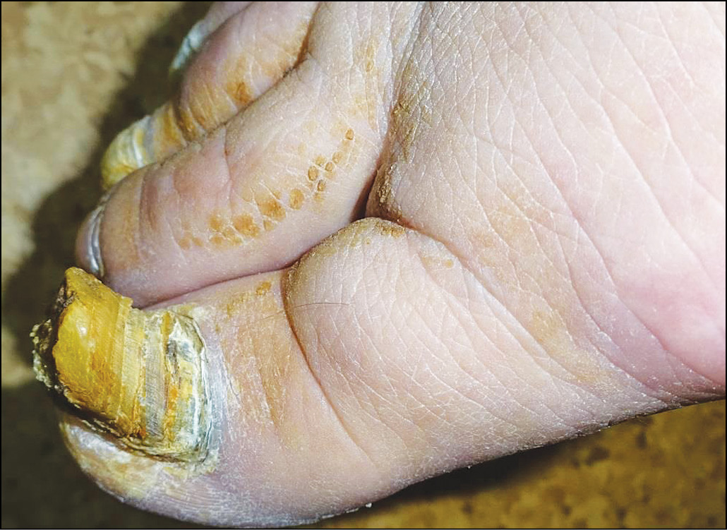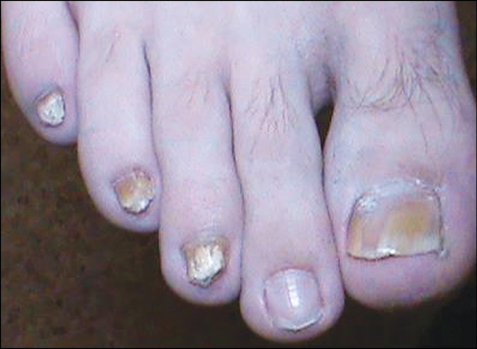 Рис. 2. Нормотрофический дистально-латеральный тип поражения ногтя 1-го пальца правой стопы и комбинированный белый поверхностный и гипертрофический тип поражения ногтей 3, 4, 5-го пальцев.