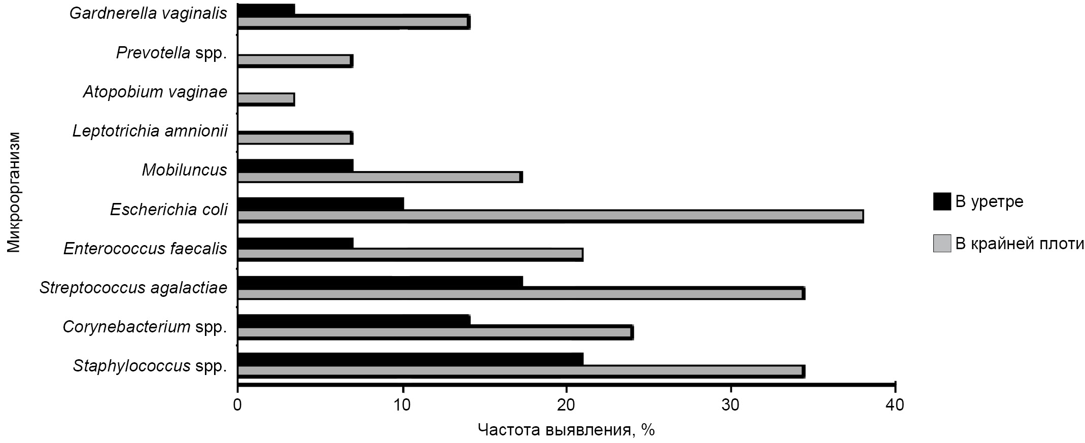 Обследование микрофлоры половых органов мужчин показало, что состав микроорганизмов, заселяющих уретру, отличается от микробиоценоза кожи полового члена. Микрофлора в образцах уретры оказалась значительно разнообразнее, чем на коже полового члена. Похожие данные были получены группой исследователей в 2018 г. [16].