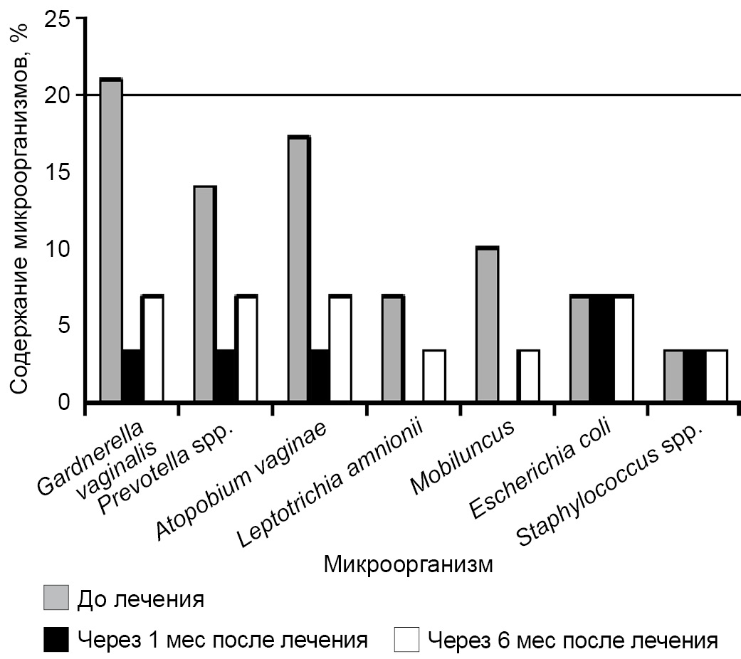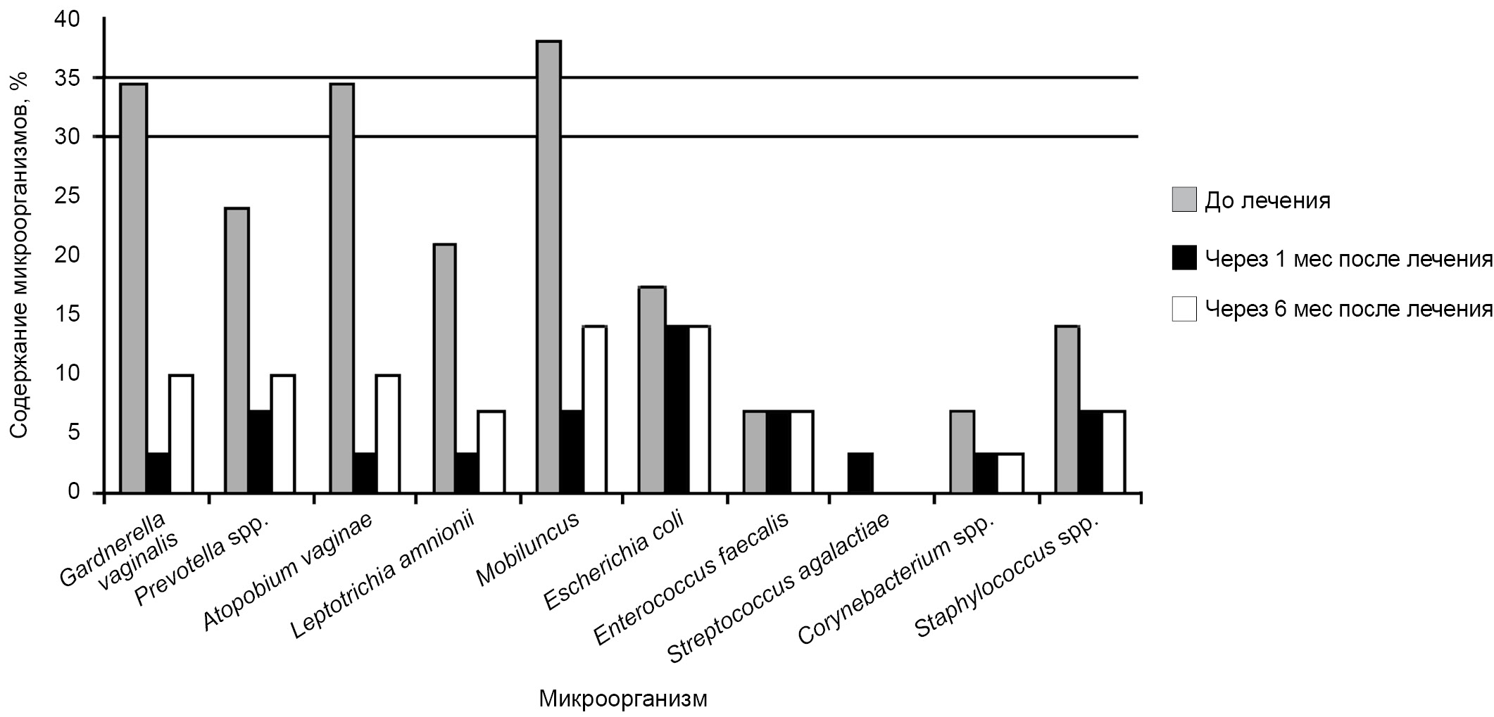 Кроме того, следует отметить, что в микробиоме влагалища женщин и половых органах мужчин продолжали персистировать условно-патогенные бактерии, на которые не воздействовала используемая антибактериальная терапия, что могло также привести к развитию рецидивов БВ.