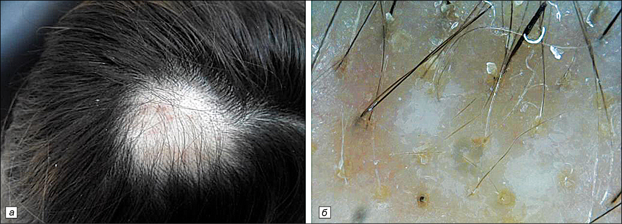 Фотография очага выпадения на расстоянии 20 см: определяется очаг выпадения с пустующими фолликулами по центру и наличием велуса и терминального волоса по периферии очага (рис. 1, а).