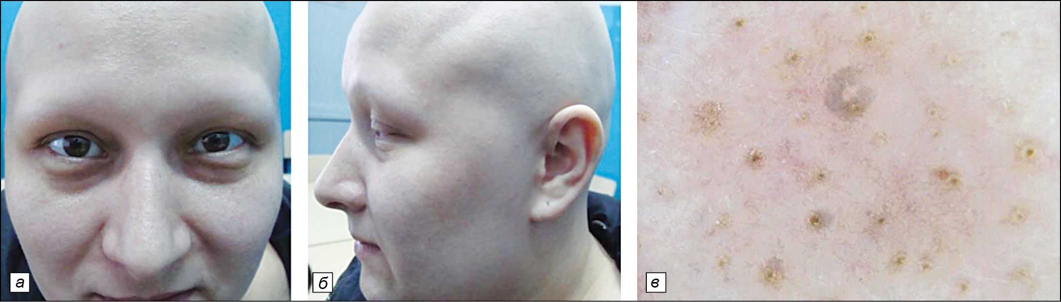 Фотография очагов выпадения волос: наблюдается тотальная потеря волос на волосистой части головы с одновременным выпадением щетинистых волос на бровях и ресницах (рис. 2, а). На теле отмечается потеря более 80% пушкового волоса с очагами выпадений в подмышечных и паховой областях.
