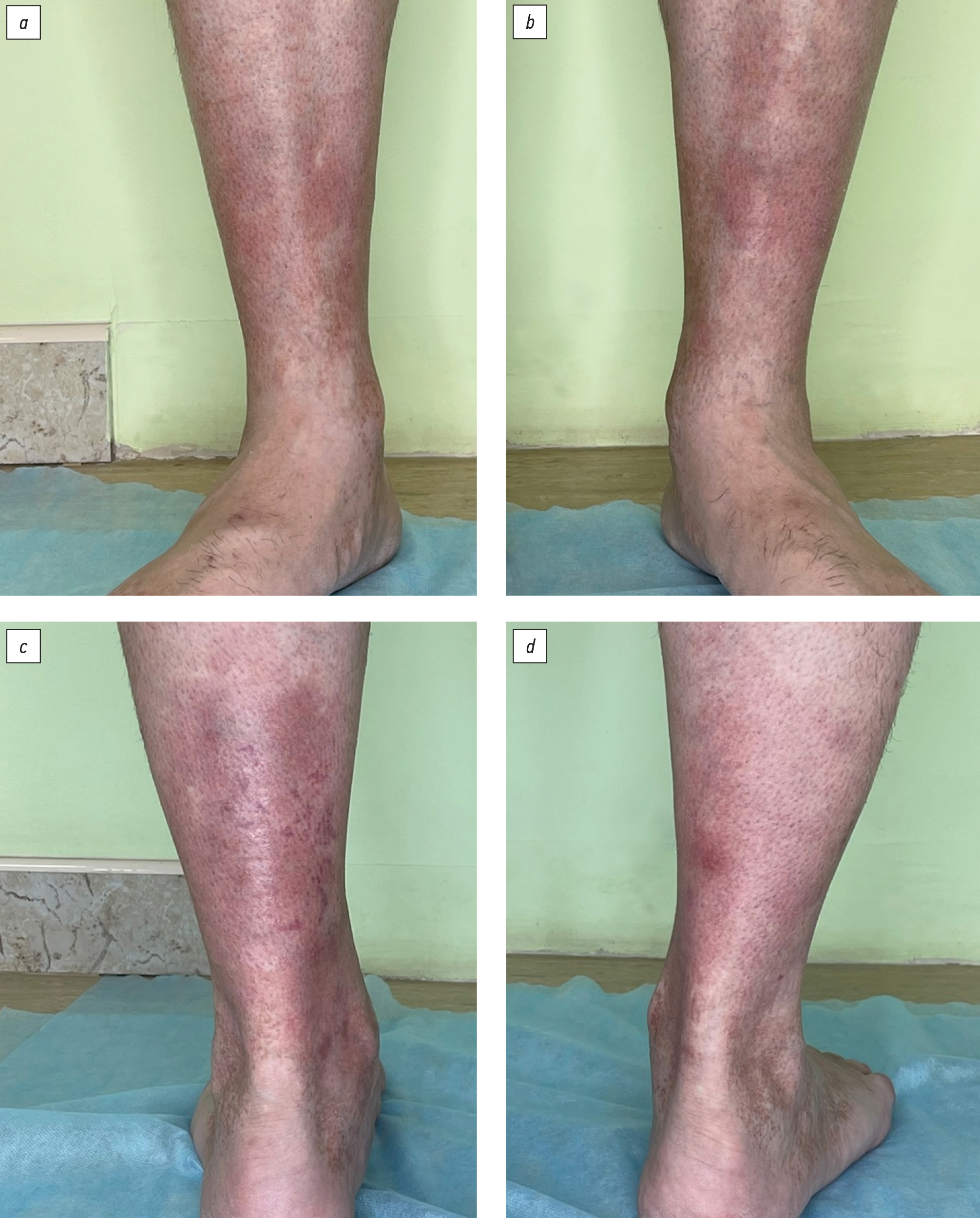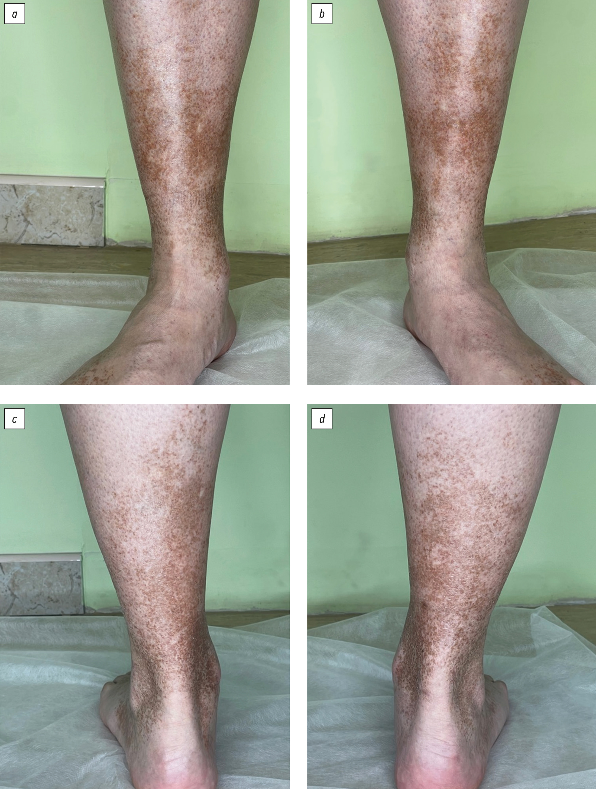 Рис. 1. Пациент Д., 34 года, болезнь Шамберга: кожный процесс до сеанса лечения широкополосным импульсным светом (a–d).