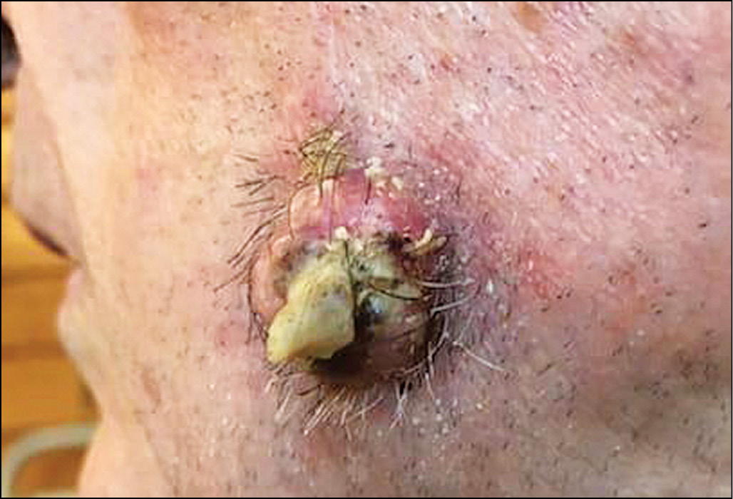 Локальный статус: на коже лица в центральной части левой щеки располагается солитарное образование в виде куполообразного крупного узла размером 2,1 × 2,3 см в диаметре, плотноэластической консистенции. В центральной части образования располагается центральный кратер, выступающий в виде гребня высотой 1,5 см, напоминающий кожный рог, окружённый светло-серыми роговыми массами. По периферии образования кожа местами синюшно-багрового цвета, множество жёстких волос. Валикообразный периферический край опухоли бледно-розового цвета, с телеангиэктазиями. Регионарные лимфатические узлы слева (подчелюстные) увеличены до размера лесного ореха (рис. 1).
