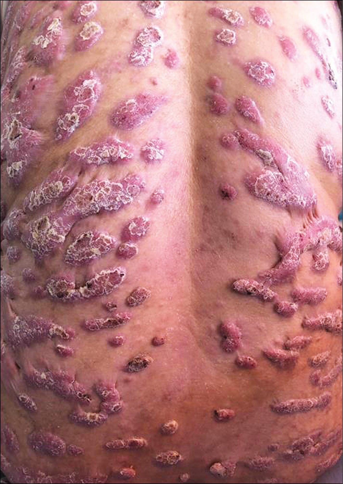 Высыпания на туловище и конечностях в виде множественных, местами сливающихся гиперкератотических, инфильтрированных узловатых и веррукозных безболезненных элементов размером до нескольких сантиметров у пациентки 60 лет, страдающей сахарным диабетом, с устойчивым к традиционным методам лечения хромомикозом.