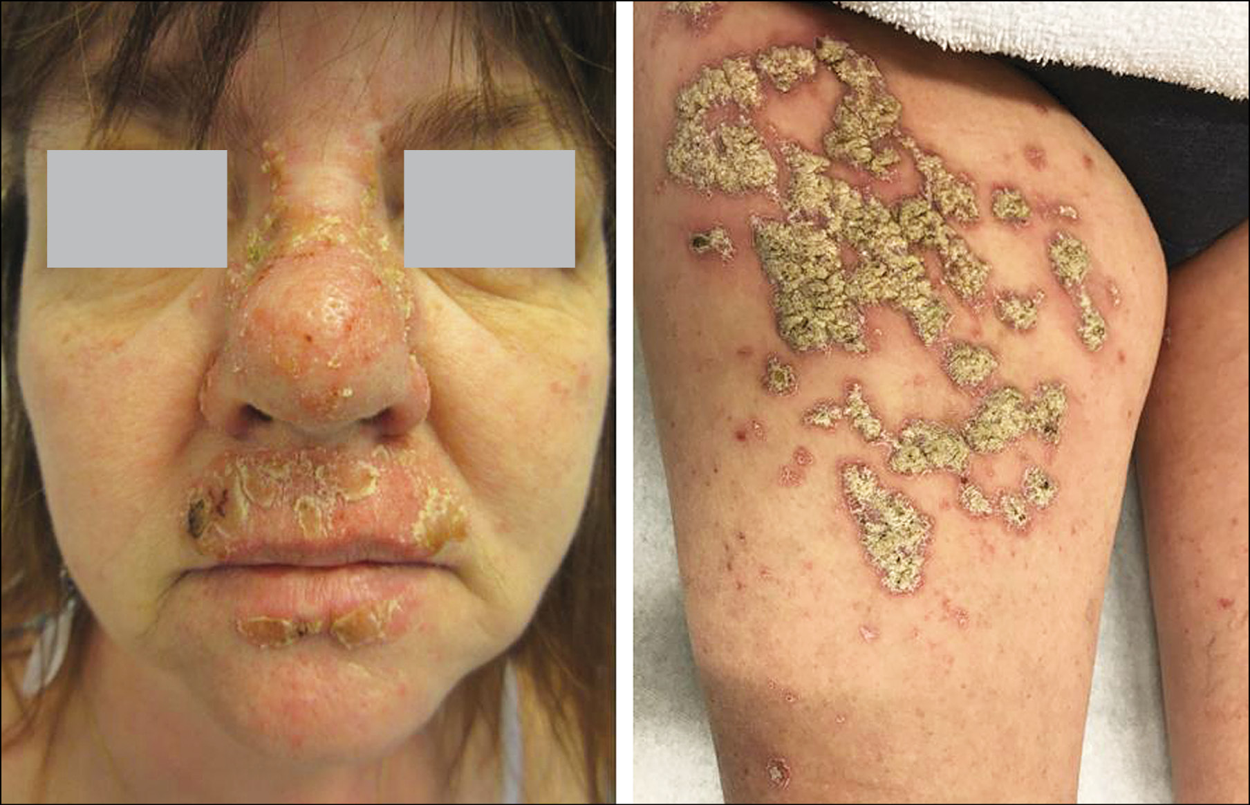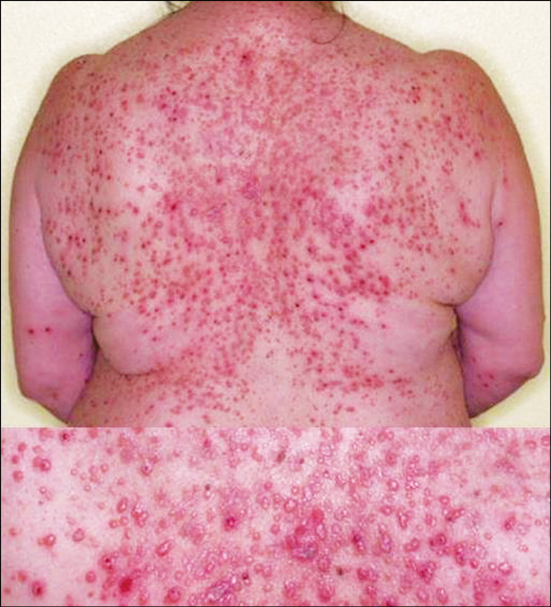 Пациентка, 64 года, обратилась в наш Институт с жалобами на появление эритематозной папулёзной сыпи. Из анамнеза известно, что женщина страдала неходжкинской лимфомой, регрессировавшей вследствие проведённой химиотерапии. При осмотре: на лице, груди и конечностях высыпания представлены множественными папулами розово-красного цвета, некоторые из которых имеют пупковидное вдавление и покрыты геморрагической корочкой. Множественные паховые и аксиллярные лимфатические узлы, подвижные и мягкие при пальпации с обеих сторон. На основании диагностической биопсии с проведением гистологического и иммуногистохимического исследования был выставлен гистиоцитоз из клеток Лангерганса. Полное диагностическое обследование, в том числе компьютерная томография всех органов и биопсия лимфатических узлов, исключили системность процесса. Также была запланирована консультация эндокринолога по поводу развившихся полиурии и полидипсии.