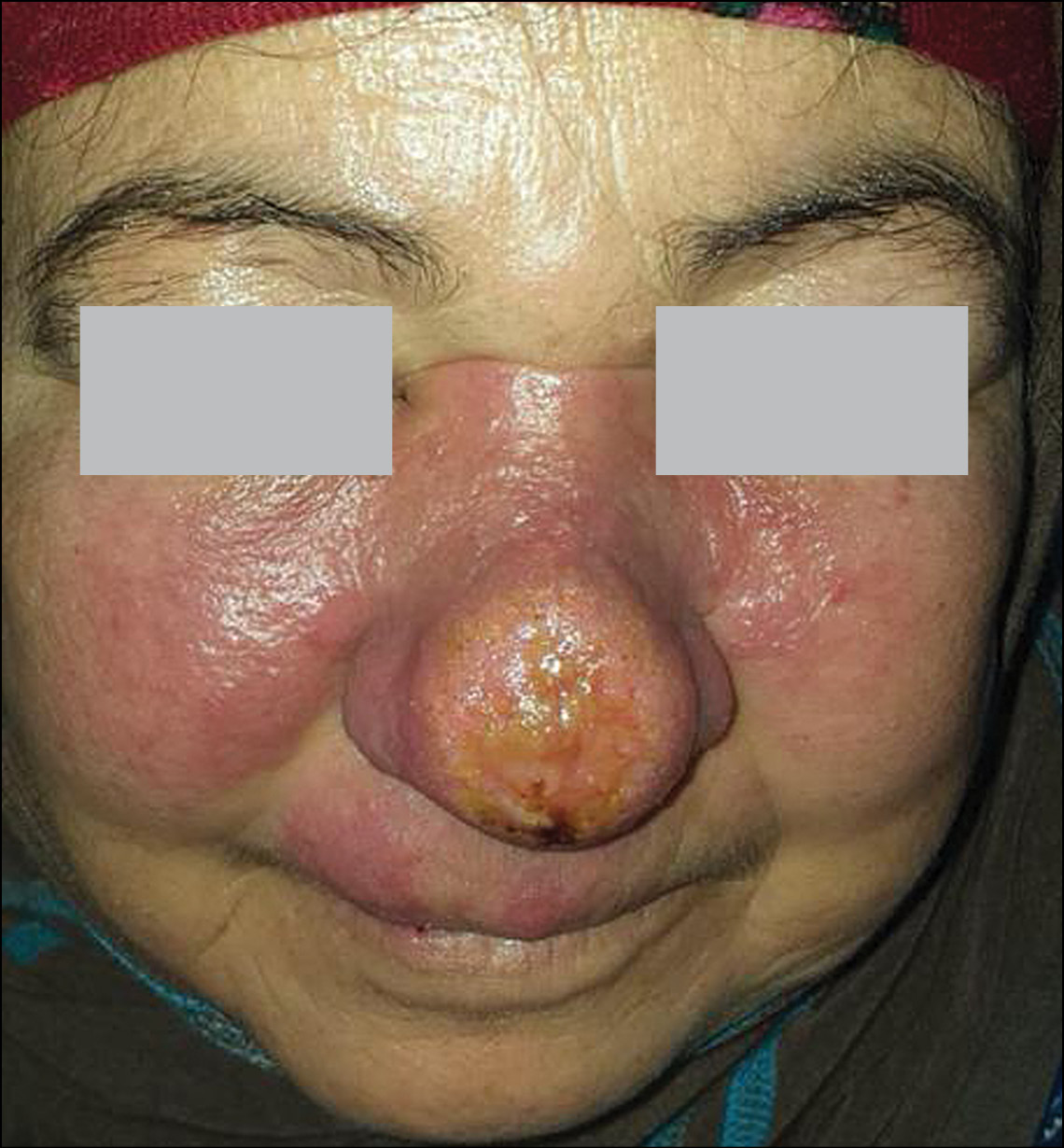 Жительница Туниса, 45 лет, ранее не обращавшаяся к врачам, поступила в клинику с появившейся 3 мес назад эритематозной инфильтрированной бляшкой с изъязвлённым центром на коже носа, распространившейся на кожу щёк. Имелось указание на предшествующий появлению высыпаний укус насекомого. Микроскопическое исследование выявило многочисленные лейшмании, что подтвердило диагноз кожного лейшманиоза. Пациентке были назначены внутримышечные инъекции меглумина антимоната в дозе 60 мг/кг в день в течение 14 дней с хорошей клинической и биологической толерантностью и достижением частичного регресса высыпаний.