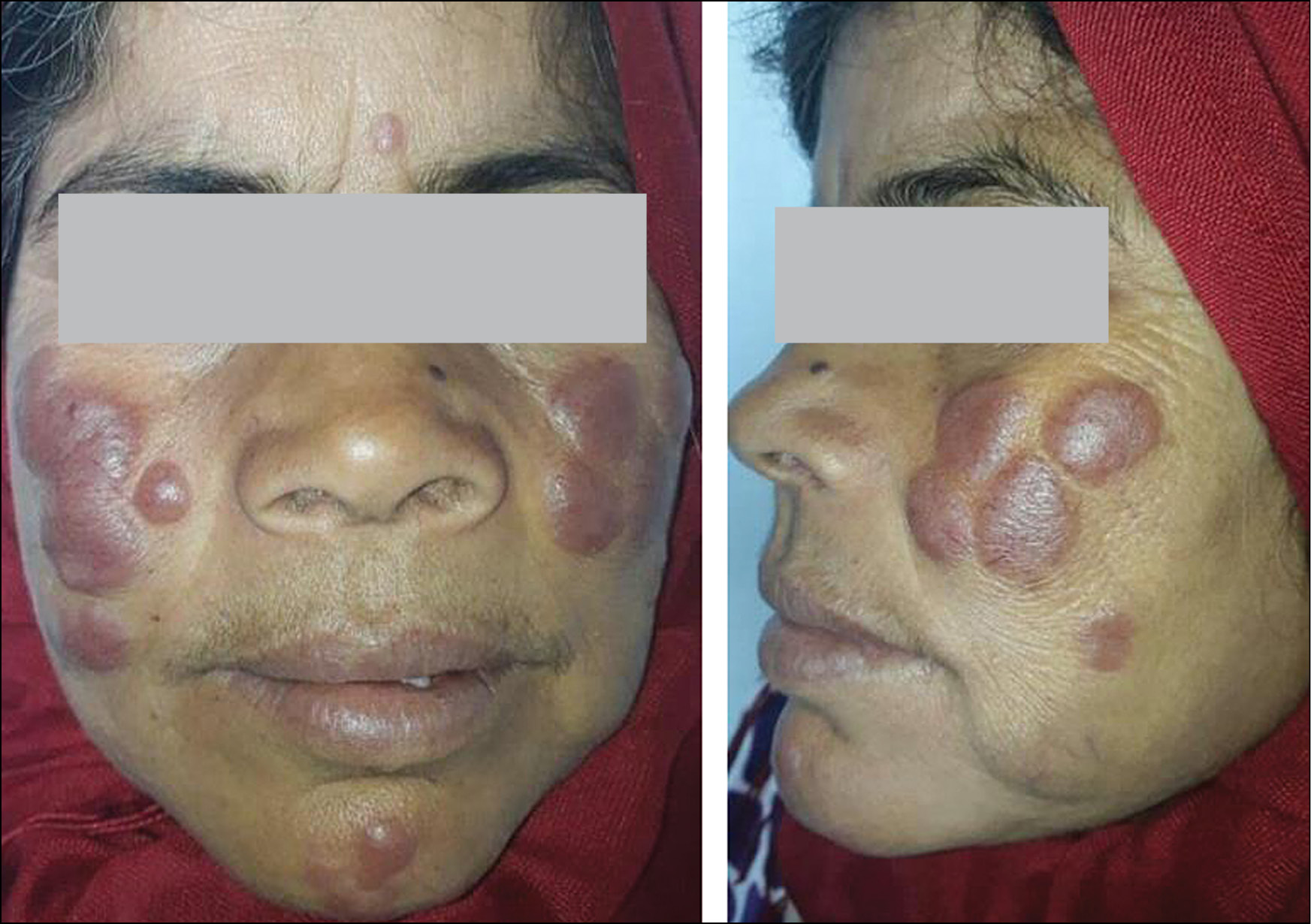 Lésions nodulaires et verruqueuses, centimétriques, érythémateuses, hyperkératosiques, infiltrées, rétractiles et confluentes par endroits, indolores, profuses, siégeant au niveau du tronc et des quatre membres, chez une patiente âgée de 60 ans, diabétique, suivie pour une chromomycose résistante aux traitements conventionnels.