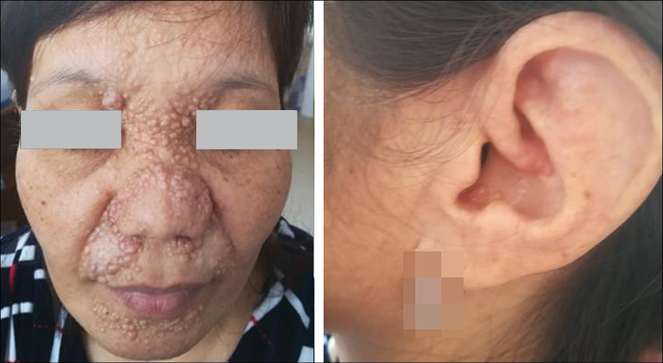 Ангиофиброма сальных желёз – кожная патология с преимущественной локализацией на лице. Клинически ангиофибромы представлены красно-коричневыми узлами (типа Прингла), цвета нормальной кожи (тип Бальцера), округлых очертаний с гладкой поверхностью, мягкой плотноэластической консистенции. Чаще всего дифференциальный диагноз проводят с вульгарными акне и розацеа, внутридермальным невоклеточным невусом, сирингомой, трихолеммомой, милиарным диссеминированным туберкулёзом лица. Клинический случай: пациентка с жалобами на высыпания на коже лица, существующими в течение 13 лет. Ранее назначенное дерматологом лечение оказалось неэффективным. Из анамнеза: аналогичный кожный процесс наблюдается у брата пациентки. При осмотре: в носу, носогубном треугольнике, на подбородке, ушных раковинах множественные ангиофибромы в виде округлых папул и небольших узлов цвета нормальной кожи, полусферической формы, плотной консистенции, размером от 1 до 10 мм в диаметре.