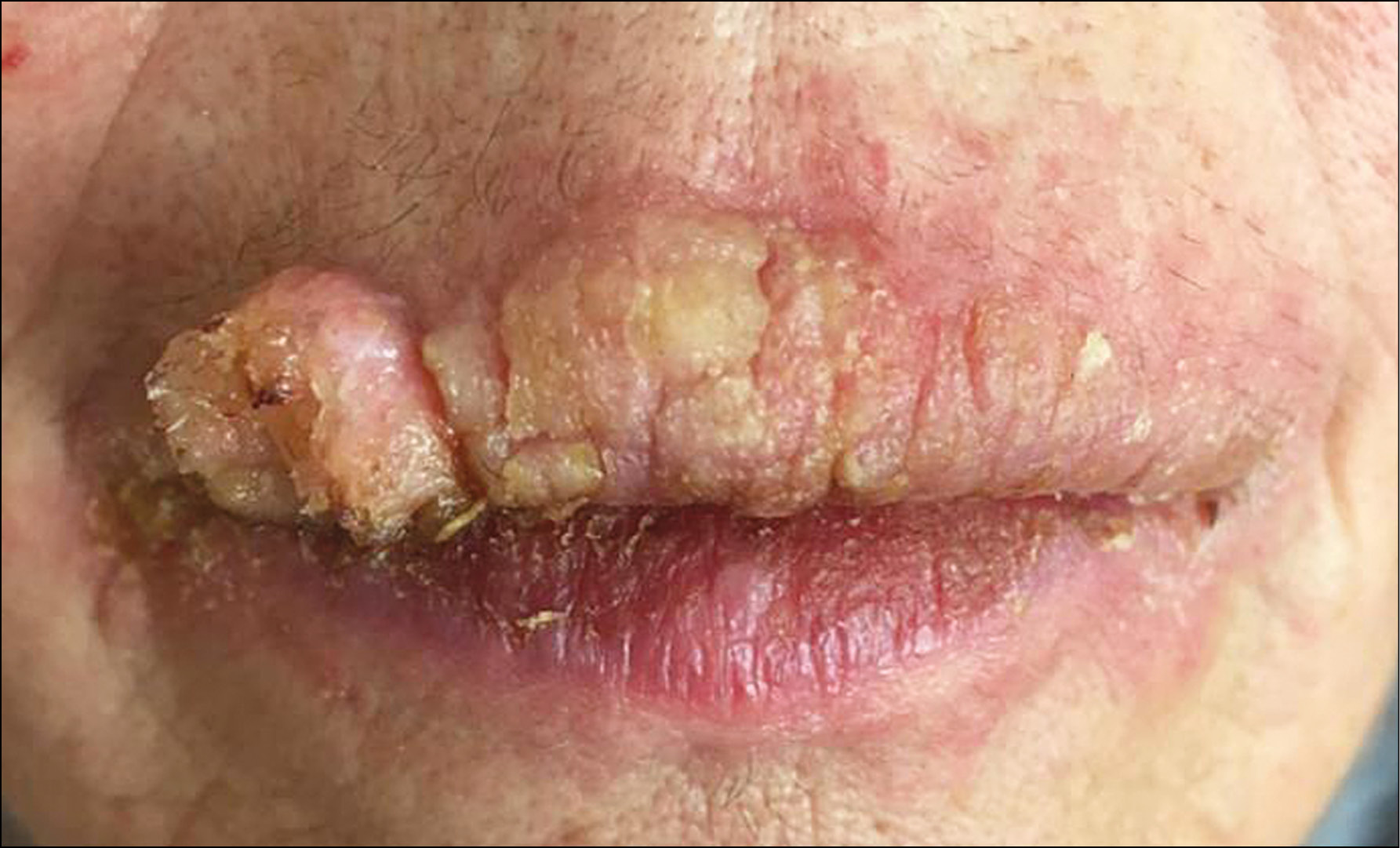 Une femme de 70 ans sans antécédent particulier consultait pour une chéilite évoluant depuis un an sans amélioration sous corticothérapie locale. L’examen clinique retrouvait un aspect verruqueux de la lèvre supérieure, associé à des lésions leucoplasiques des muqueuses labiales, gingivales, linguales et du palais supérieur. Des biopsies réalisées respectivement au niveau des versants externes et internes de la lèvre supérieure, et de la langue retrouvaient un aspect histologique compatible avec un lichen plan sans signe évocateur d’une transformation néoplasique y compris pour la tuméfaction externe droite de la lèvre supérieure dont l’exérèse complète était finalement effectuée. La numération formule, l’électrophorèse des protéines sanguines étaient normales, les sérologies des hépatites virales étaient négatives. Le diagnostic de lichen plan buccal hyperkératosique verruqueux était retenu. Un traitement systémique par acitretine 25 mg par jour permettait en un mois une nette amélioration de la chéilite et de l’atteinte muqueuse.