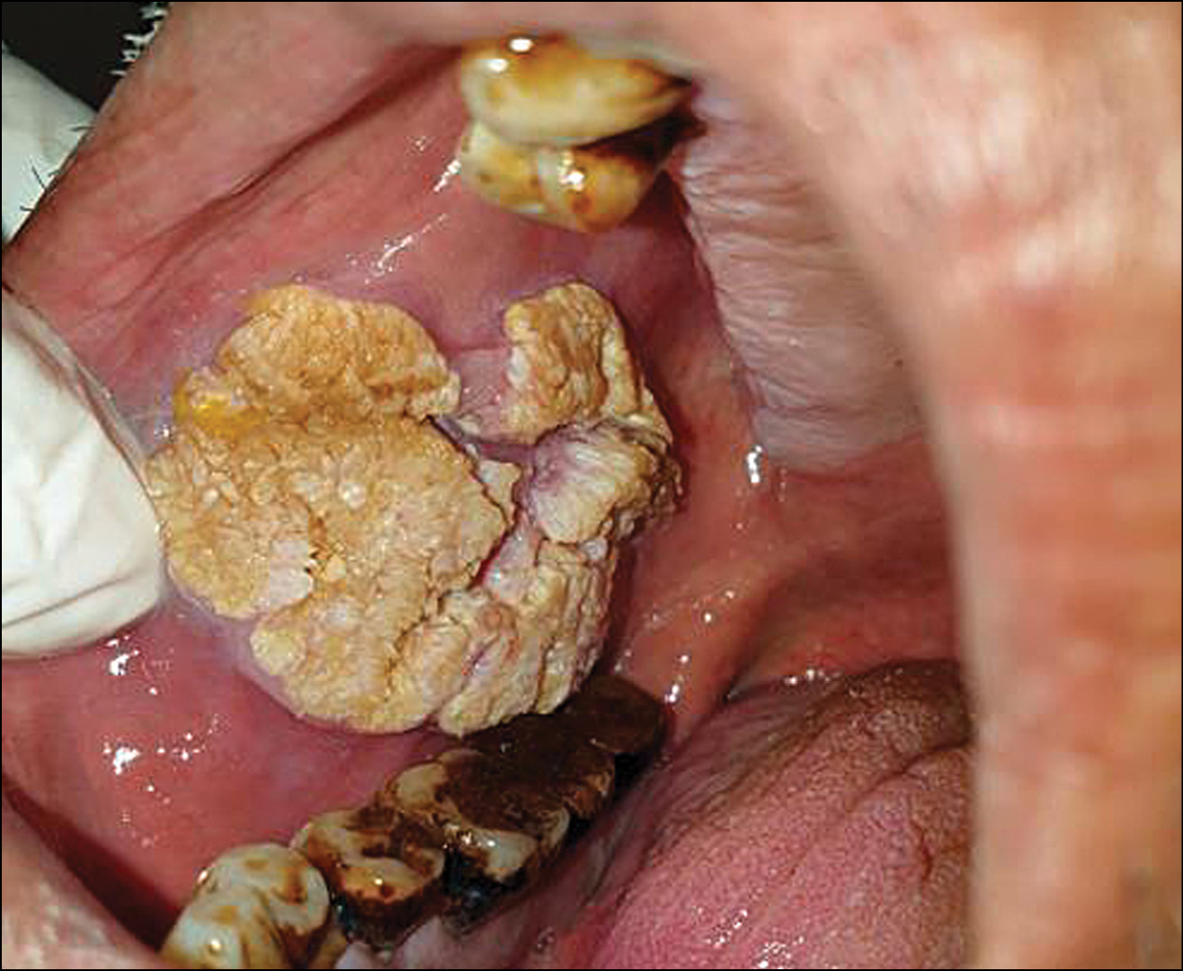 Курящий пациент, 67 лет, обратился в клинику с быстро увеличивающимися в размерах высыпаниями на слизистой оболочке правой щеки. Вначале пациент наблюдался в отделении оториноларингологии, где была выполнена диагностическая биопсия, выявившая псевдоэпителиомную гиперплазию и большое количество грибов рода Candida. Пациенту был выставлен хронический гиперпластический кандидоз и назначены системные противогрибковые препараты. За 2 мес проводимой терапии эффекта не отмечалось. Осмотр при обращении пациента в наше отделение дерматологии показал следующее: экзофитная масса белого цвета; опухоль с чёткими границами размером до 4 см; регионарные лимфатические узлы не пальпируются. На основании данных глубокой биопсии была выставлена веррукозная карцинома полости рта. Региональных или отдалённых метастазов не обнаружено. Пациент направлен в отделение челюстно-лицевой хирургии, где ему была проведена хирургическая резекция опухоли с реконструкцией дефекта с помощью лоскута.