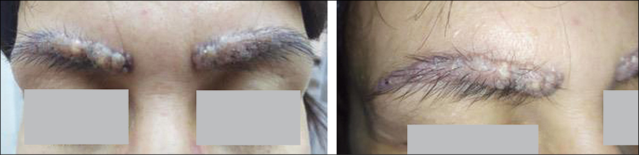 Пациентка, 30 лет, обратилась с жалобами на высыпания в зоне бровей. Из анамнеза известно, что 2 мес назад она делала татуаж бровей, после чего постепенно начали появляться узловатые высыпания. Пациентка подумала, что у неё развилась аллергическая реакция на процедуру и приняла самостоятельное решение применять антигистаминные препараты и наносить кортикостероидную мазь, что не привело к улучшению. Высыпания увеличивались в размерах и распространились на всю область бровей. Пациентка обратилась в нашу клинику. Результаты анализов крови в пределах нормы, грибковая инфекция не обнаружена. Гистологическое исследование выявило тело моллюска в нижнем слое эпидермиса и верхней трети дермы. На основании полученных результатов пациентке был диагностирован контагиозный моллюск и назначено необходимое лечение.