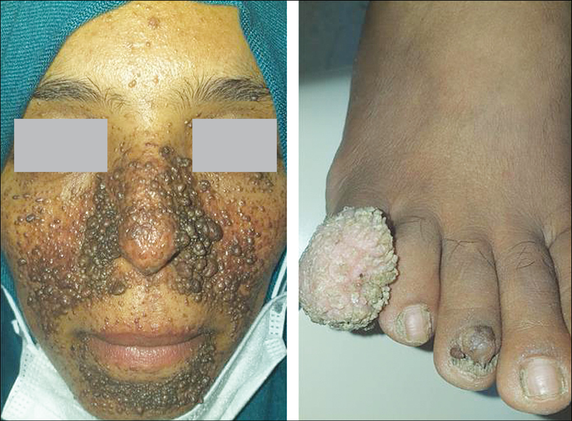 A 25 year-old woman presented with a verrucous painful tumor on the fifth toe growing since 1 year. On physical examination, she had multiple angiofibromas on the face, numerous ungual fibromas, a shagreen patch on the lower back and a verrucous tumor on the fifth toe. She had a history of nephrectomy due to angiomyolipoma. Based on these clinical findings, the diagnosis of tuberous sclerosis was confirmed. Multisystemic investigations returned without abnormalities. She was refered to surgical departement for excision of the verrucous lesion and histologic examination. Sclerosis tuberosis is a genetic disorder that presents multiple dermatologic manifestations. A careful examination is needed for a better follow-up.