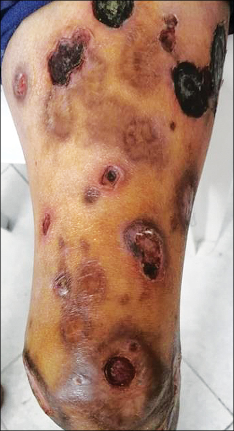 Фото 1: Язвы на нижних конечностях с пурпурно-эритематозным контуром на некротическом фоне