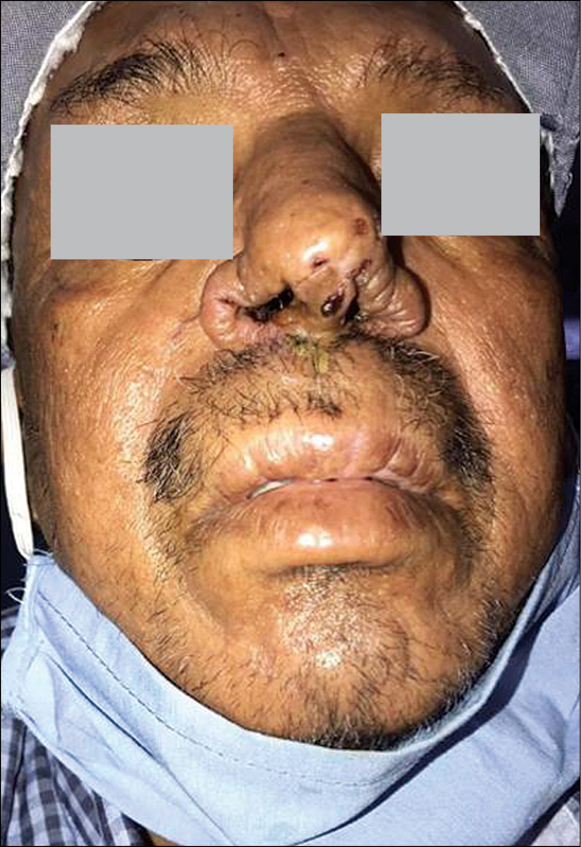 Фото 2: Появление седловидного носа с изъязвлениями колумеллы и дольки носа