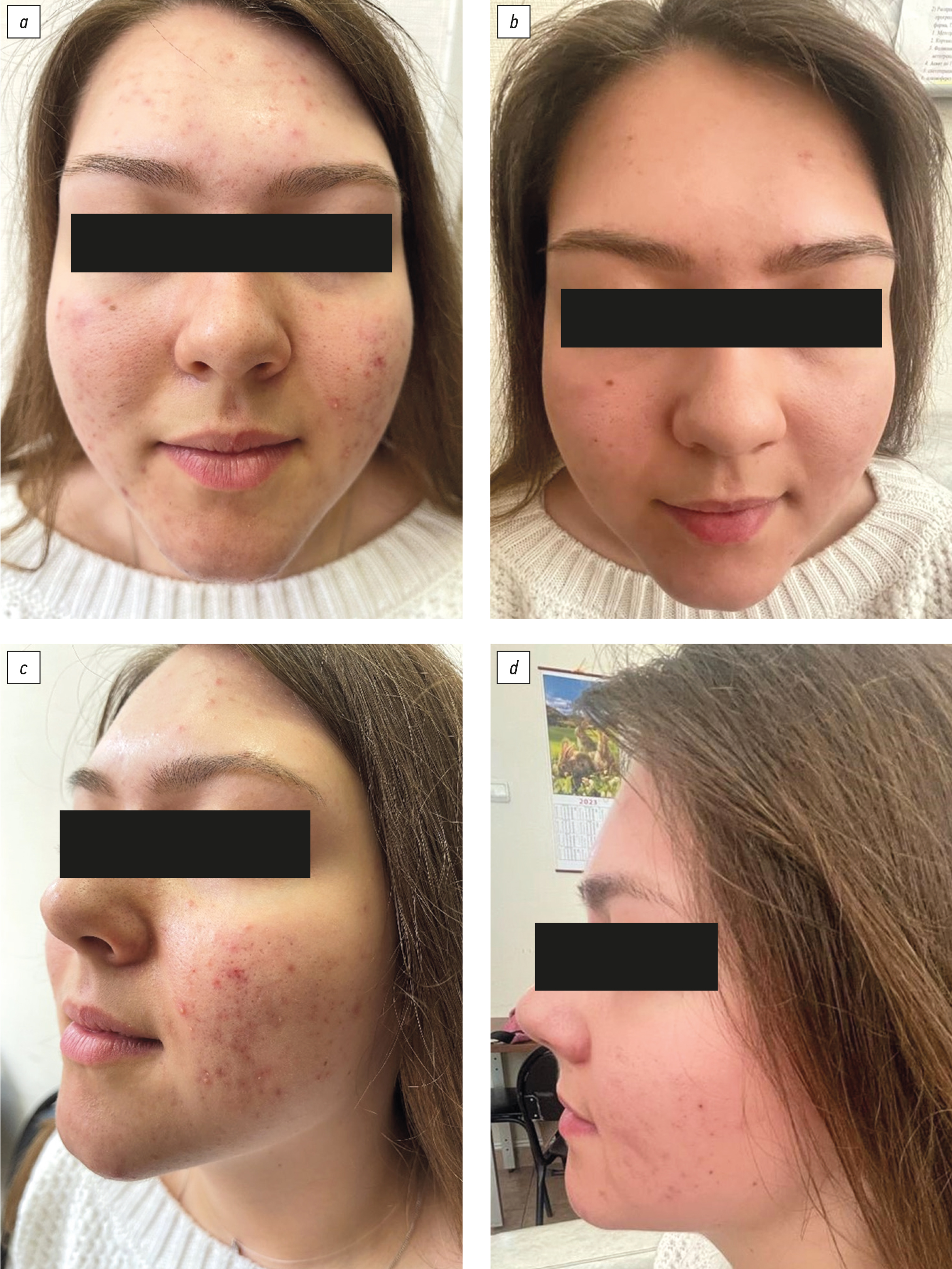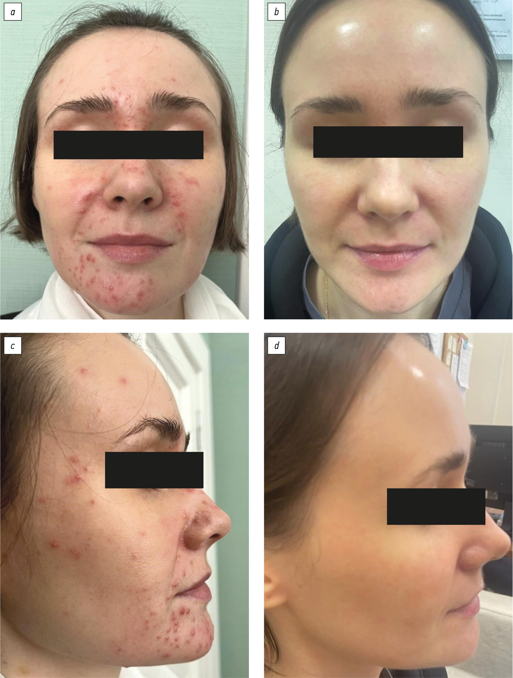 Рис. 4. Пациентка О., 22 года, до и после лечения: анфас (a, b) и профиль (c, d). Отмечается значительное улучшение.
