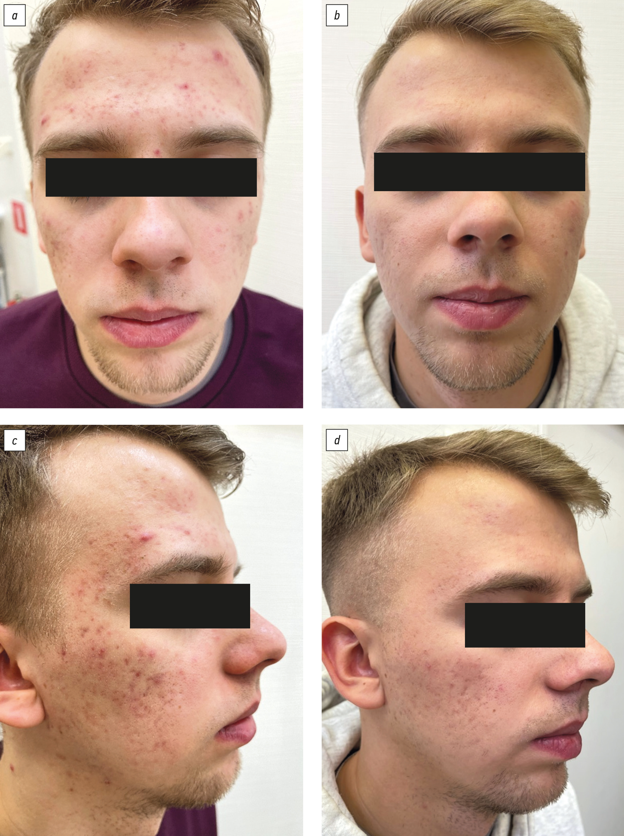 Рис. 6. Пациент Ц., 25 лет, до и после лечения: анфас (a, b) и профиль (c, d). Видимое улучшение.