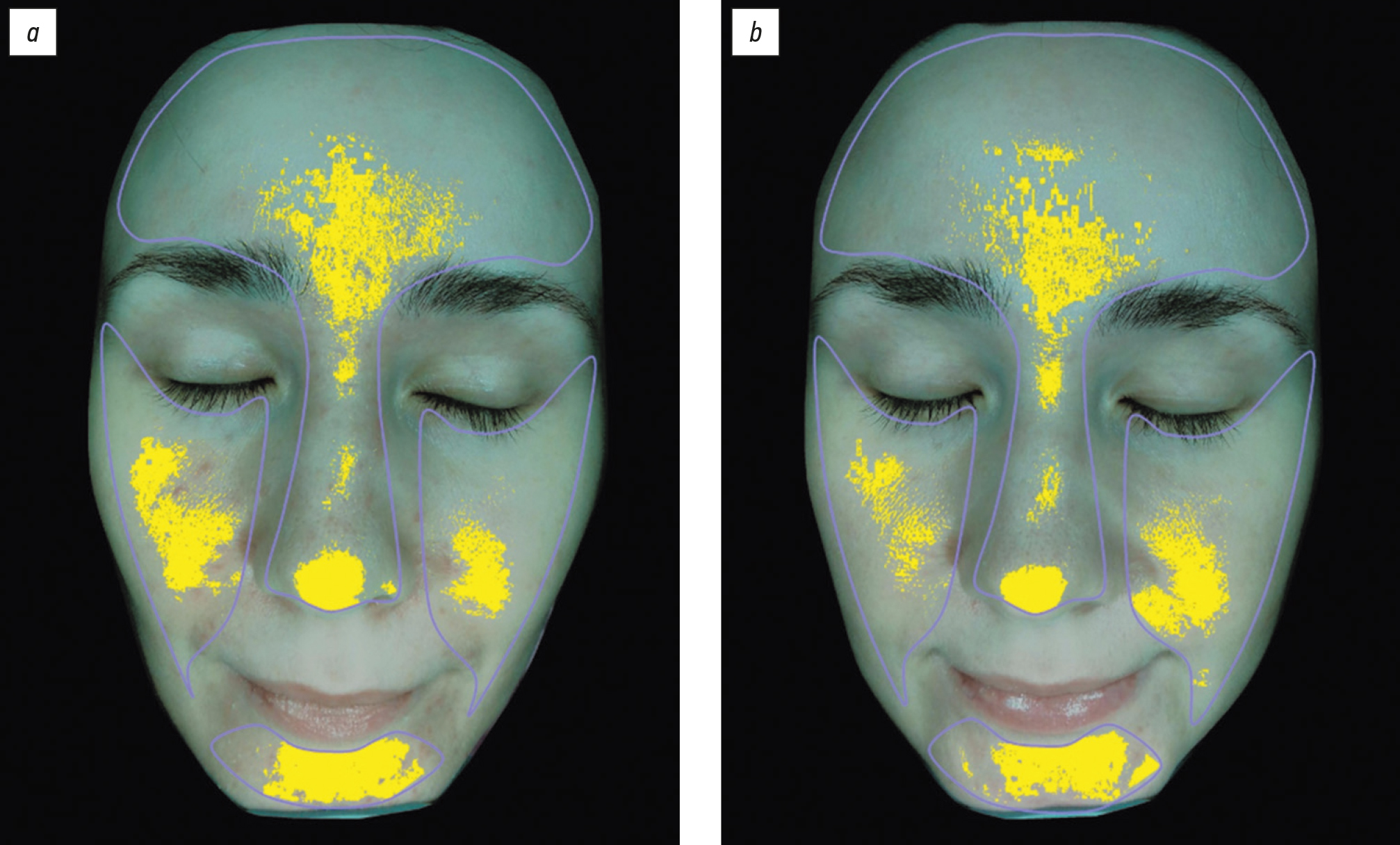 Рис. 8. Пациентка Ф., 34 года: а ― до лечения; b ― после лечения. Отсутствие выраженного себорегулирующего эффекта (области себума выделены жёлтым цветом).