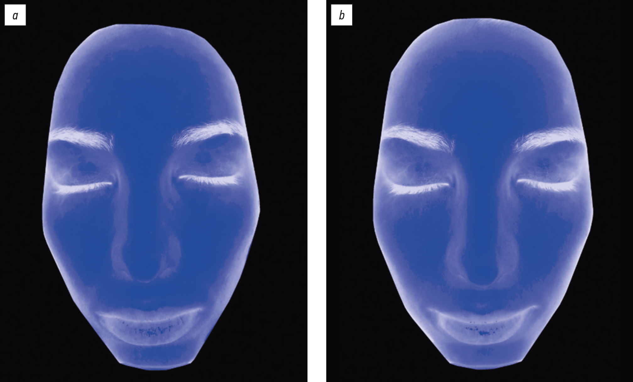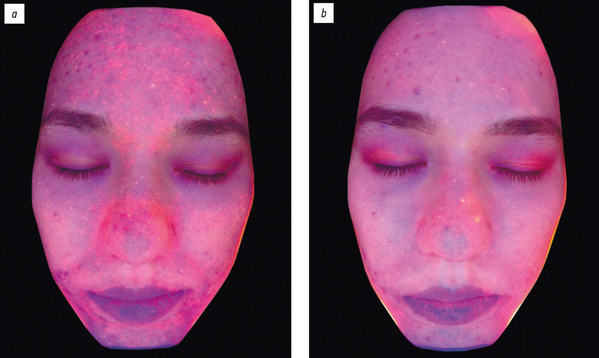 Рис. 7. Пациентка Г., 18 лет: а ― до лечения; b ― после лечения. Отсутствие выраженного себорегулирующего эффекта (об- ласти себума выделены жёлтым цветом).
