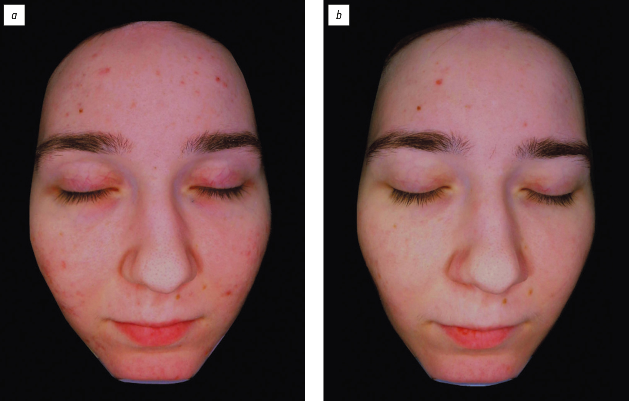 Рис. 14. Пациентка О., 22 года: а ― до лечения; b ― после лечения. Отсутствие реактивности кожи во время лечения.