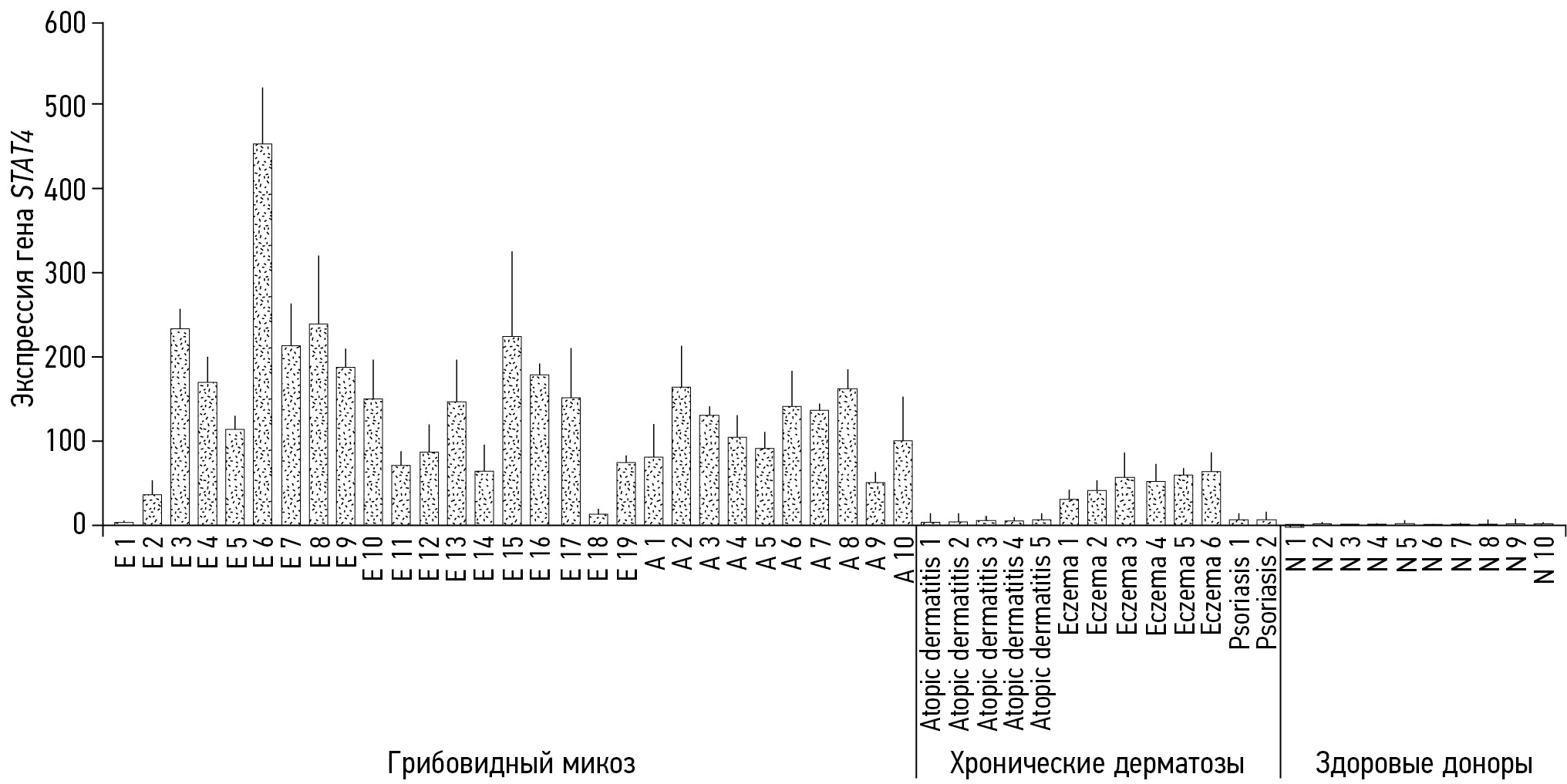 Рис. 1. Экспрессия гена STAT4 у больных грибовидным микозом и хроническими доброкачественными дерматозами по сравнению со здоровыми донорами. / Fig. 1. Expression of the STAT4 gene in patients with fungal mycosis and chronic benign dermatoses compared with healthy donors.