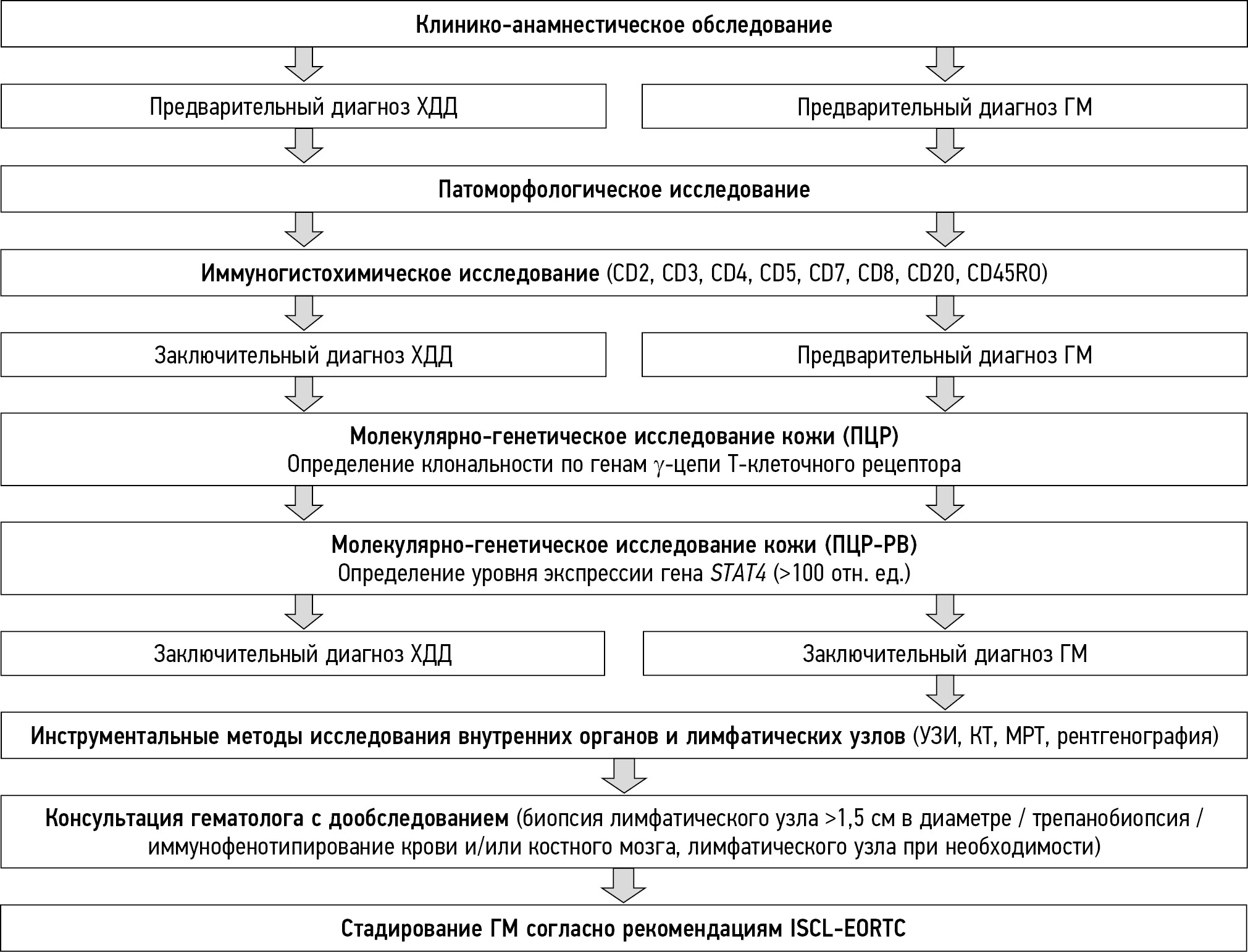 Таким образом, диагноз ГМ устанавливают, в первую очередь, на основании клинических проявлений заболевания, гистологических (часто неоднократных) и иммунофенотипических исследований биоптатов из очагов поражения кожи в сочетании с молекулярно-генетическим анализом (определение реаранжировки гена γ-цепи Т-клеточного рецептора) [1]. Выявлено, что средний срок до установления диагноза даже у больных классической формой ГМ составляет около 5 лет и может значительно удлиняться при других вариантах его течения [5].