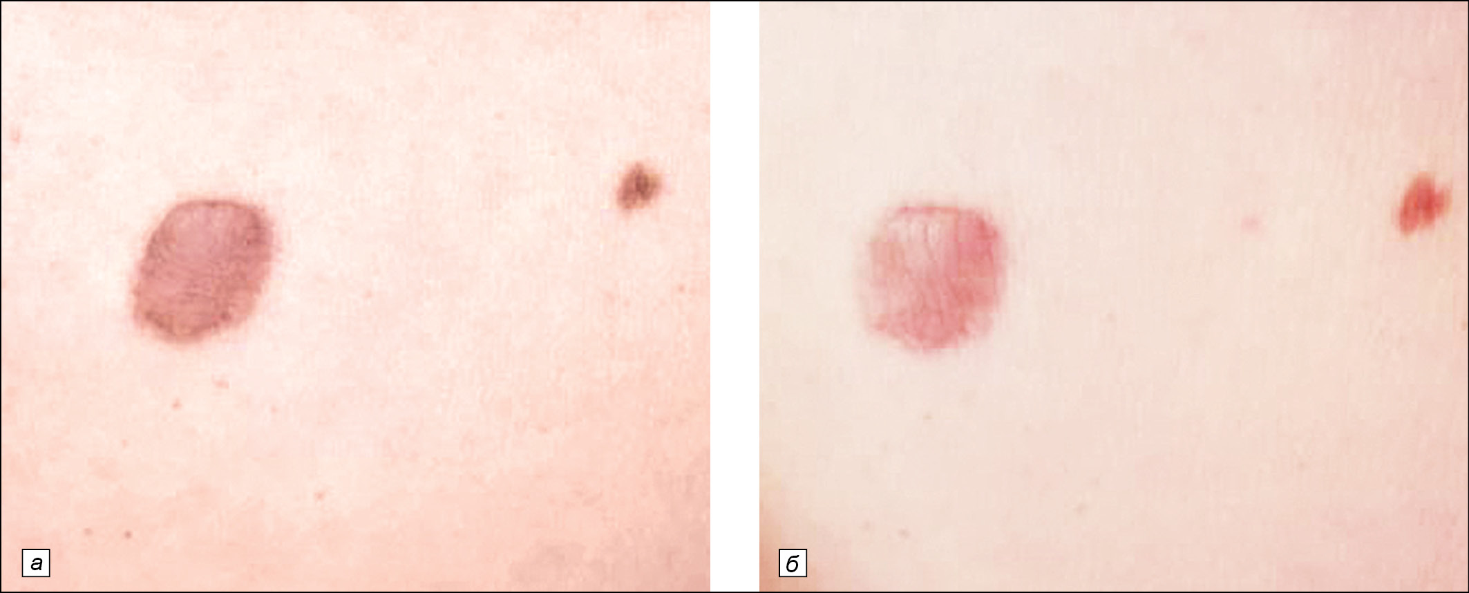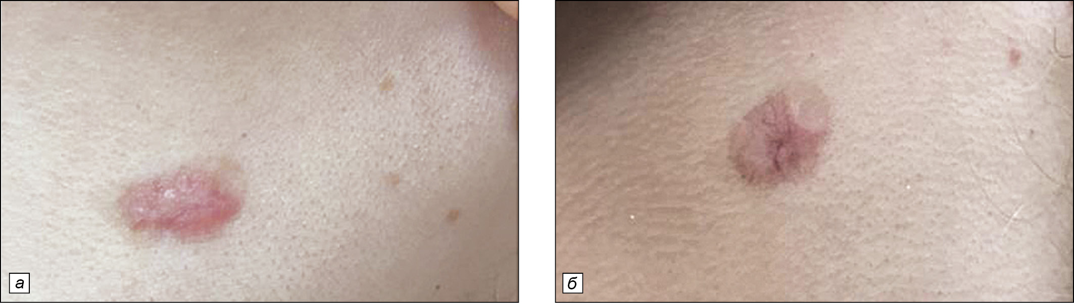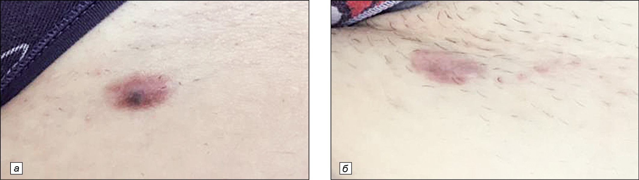 Рис.2. Пациентка Р., 24 года. Келоидный рубец на коже паховой области: а- до лечения, б - через 16 нед после окончания комбенированной терапии (Дипроспан+5-FU)