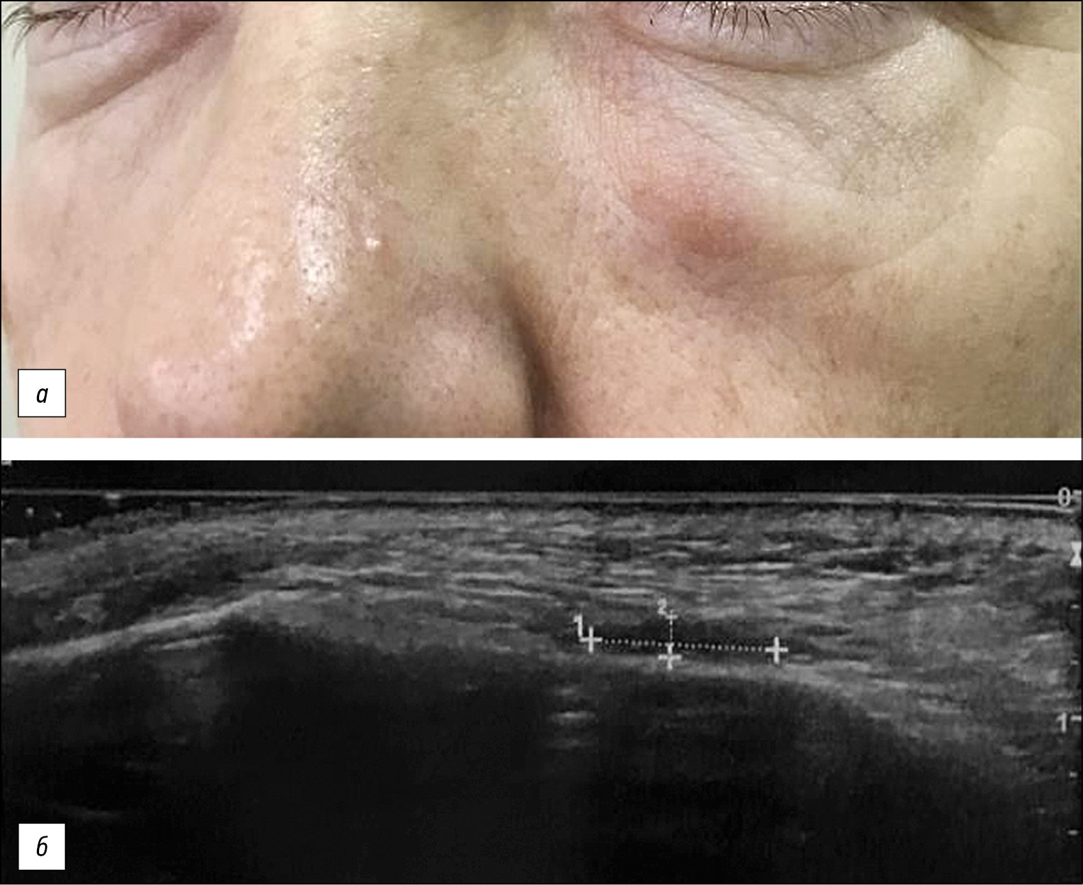 Рис. 1. Пациентка В., 53 года, диагноз: L08.9 Местная инфекция кожи и подкожной клетчатки неуточнённая; T81.9 Осложнение процедуры неуточнённое. Отёк и эритема в области носослёзной борозды слева: а ― на момент обращения в клинику б ― ультразвуковое исследование кожи и мягких тканей в области левой носослёзной борозды. / Fig. 1. Patient B., 53 years old, diagnosis: L08.9 Local infection of the skin and subcutaneous tissue, unspecified; T81.9 Complication of procedure, unspecified Edema and erythema in the area of the nasolacrimal groove on the left: а ― at the time of going to the clinic; б ― ultrasound examination of the skin and soft tissues in the area of the left nasolacrimal groove.
