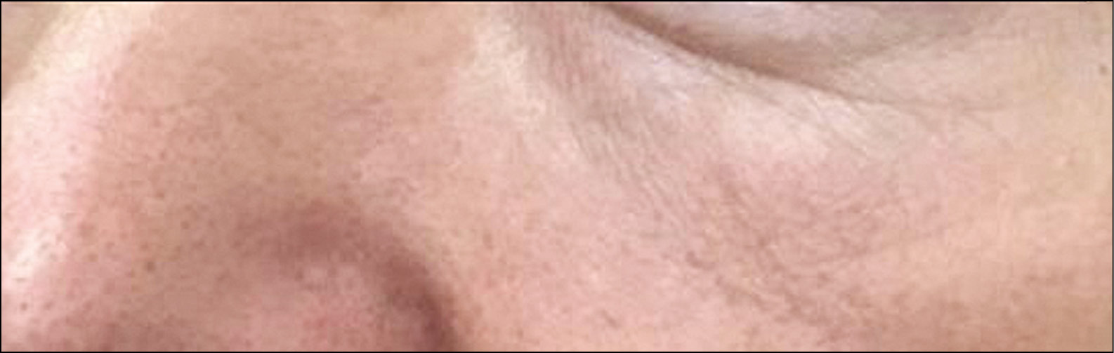 Рис. 2. Та же пациентка. Область носослёзной борозды слева через 3 нед. после окончания терапии. / Fig. 2. The same patient. The area of the nasolacrimal groove on the left 3 weeks after the end of therapy.