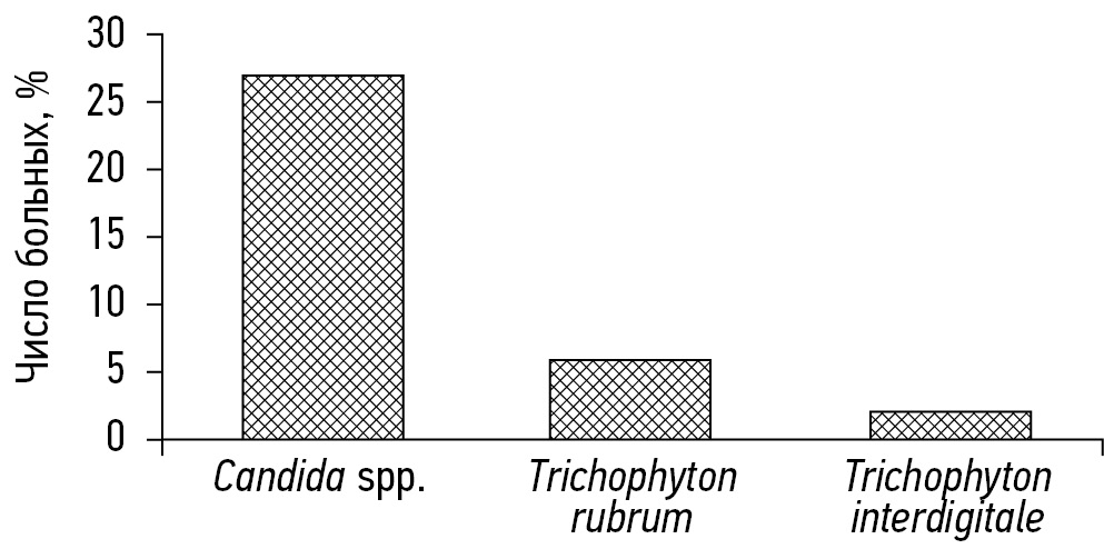 В основном онихомикоз вызывают дерматофиты, грибы рода Trichophyton spp., Microsporum spp., Epidermophyton spp., однако выводы относительно распространённости и этиологии онихомикоза у больных псориазом по данным литературы неоднозначны. Так, в ряде стран на долю Trichophyton rubrum приходится приблизительно 80–90% случаев онихомикоза [7]. Исследования этиологии онихомикозов у больных псориазом показали, что основными возбудителями в большинстве случаев являются дерматомицеты [9–11]. В единичных исследованиях частота встречаемости дрожжей среди больных псориазом выше по сравнению с группой контроля [12]. Имеются работы о высокой этиологической значимости в развитии онихомикоза у больных псориазом плесневых грибов рода Aspergillus spp. [13].