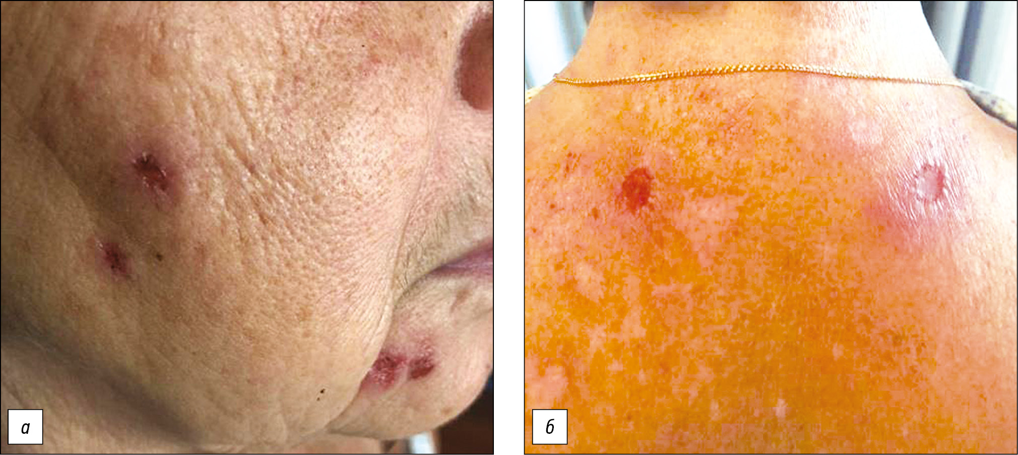 Рис. 1. Артифициальный дерматит у пациентки с болезнью Альцгеймера: а ― область щёк и подбородка; б ― на спине. / Fig. 1. Artifical dermatitis in a patient with Alzheimer's disease: а ― cheeks and chin; б ― on the back.