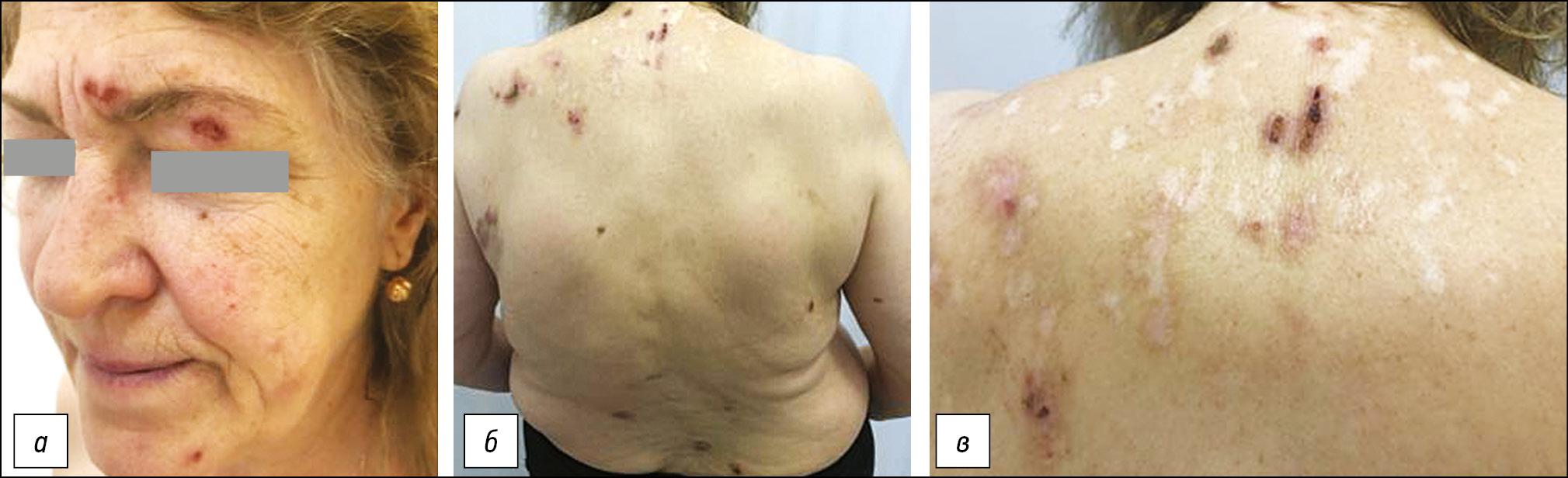 Рис. 2. Артифициальный дерматит в рамках ограниченной ипохондрии, развившийся на фоне утраты близкого родственника: а ― на верхнем веке и переносице; б, в ― на спине. / Fig. 2. Artifical dermatitis within the limited hypochondria, which developed against the background of the loss of a close relative: а ― on the upper eyelid and the bridge of the nose; б, в ― on the back.