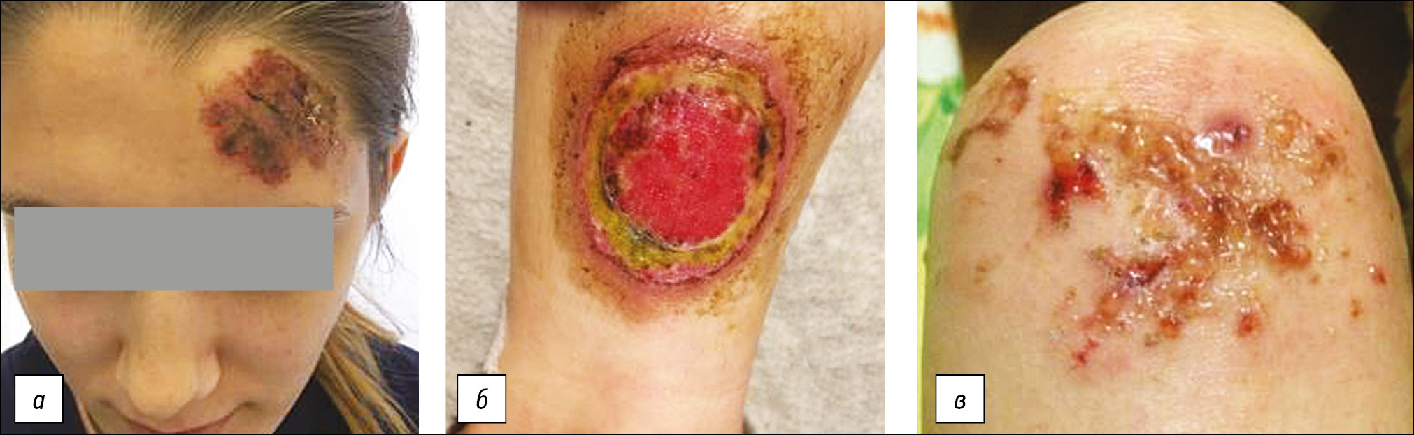 Рис. 3. Артифициальный дерматит в рамках ограниченной ипохондрии у больной шизофренией: а ― на лбу; б ― на голени; в ― на колене. / Fig. 3. Artifical dermatitis within the limited hypochondria in a patient with schizophrenia: а ― on the forehead; б ― on the lower leg; в ― on the knee.