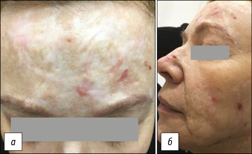 Рис. 4. Невротические экскориации, развившиеся на фоне тяжёлого бракоразводного процесса: а ― на лбу; б ― на щеке. / Fig. 4. Neurotic excoriation, developed against the background of a severe divorce process: а ― on the forehead; б ― on the cheek.