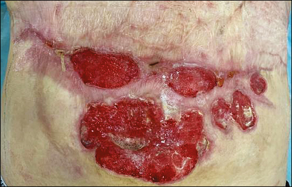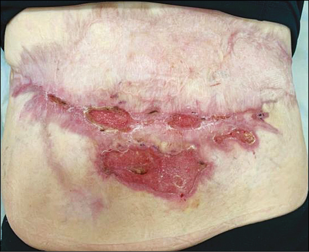 Больная Д., 29 лет, обратилась в клинику кожных и венерических болезней имени В.А. Рахманова Сеченовского Университета с жалобами на высыпания на коже передней брюшной стенки, сопровождающиеся болезненностью. Из анамнеза: считает себя больной с февраля 2016 г., когда, с её слов, после введения хлористого кальция в область верхней трети левого предплечья по поводу фурункулёза появились гнойно-некротические очаги. Хирург по месту жительства провёл некрэктомию тканей. Впоследствии процесс неоднократно рецидивировал, однако хирургическая обработка в сочетании с общей и местной антибактериальной терапией, включая кожную пластику, оказывали временный положительный эффект в виде частичного рубцевания язвенных дефектов. В августе 2017 г. после самостоятельного вскрытия пузыря на дистальной фаланге второго пальца левой кисти привело к сухой гангрене с последующей ампутацией пальца до уровня средней фаланги. В марте 2018 г. больная отметила появление новых высыпаний на коже живота в виде язвенно-некротических дефектов. Проводимая антибактериальная, противовоспалительная, сосудистая терапия носила слабый и непродолжительный эффект. В течение 1 мес больная находилась на стационарном лечении в ревматологическом отделении Республиканской клинической больницы имени Ш.Ш. Эпендиева (г. Грозный) с диагнозом язвенно-некротического ангиита, получала Метипред в дозе 8 мг/сут, азатиоприн по 100 мг/сут с незначительным улучшением. В ноябре 2018 г. после комплексного консервативного лечения (преднизолон по 20 мг/сут, Клексан, Конкор, Омез, диклофенак, Найз, амитриптилин внутрь; инфузионно Актовегин, Панангин, Трентал, Реополиглюкин, Мексидол, Метрогил, ципрофлоксацин, амоксиклав, Ксефокам) была выполнена серия этапных некрэктомий с последующим закрытием раневых дефектов. С мая по сентябрь 2019 г. трижды больная находилась на госпитализации в хирургическом отделении ГКБ № 23 имени И.В. Давыдовского (Москва) по поводу болезненных гнойно-некротических ран на передней брюшной стенке. В связи с тяжестью и распространённостью кожного процесса, неэффективностью проводимой терапии во время последнего пребывания в стационаре пациентку проконсультировали в нашей клинике, где с предварительным диагнозом гангренозной пиодермии она получила направление на госпитализацию.