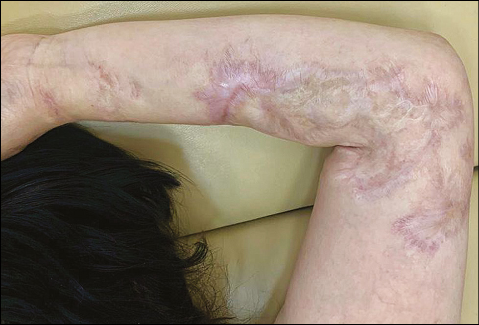 Рис. 7. Та же больная. Рубцы после ножевых порезов в области левого предплечья. / Fig. 7. The same patient. Scars after stab cuts in the left forearm.