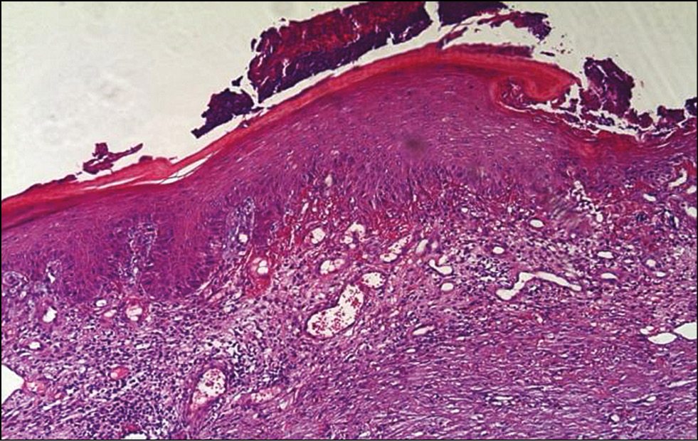 При гистологическом исследовании биоптата очага поражения обнаружено: в дерме диффузный инфильтрат, состоящий из лимфоцитов, лейкоцитов, гистиоцитов. Явления васкулита и лейкоклазии отсутствуют. Просвет сосудов зияет, некоторые сосуды заполнены эритроцитами. Коллагеновые волокна уплотнены (рис. 8).