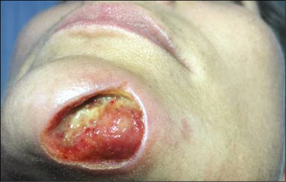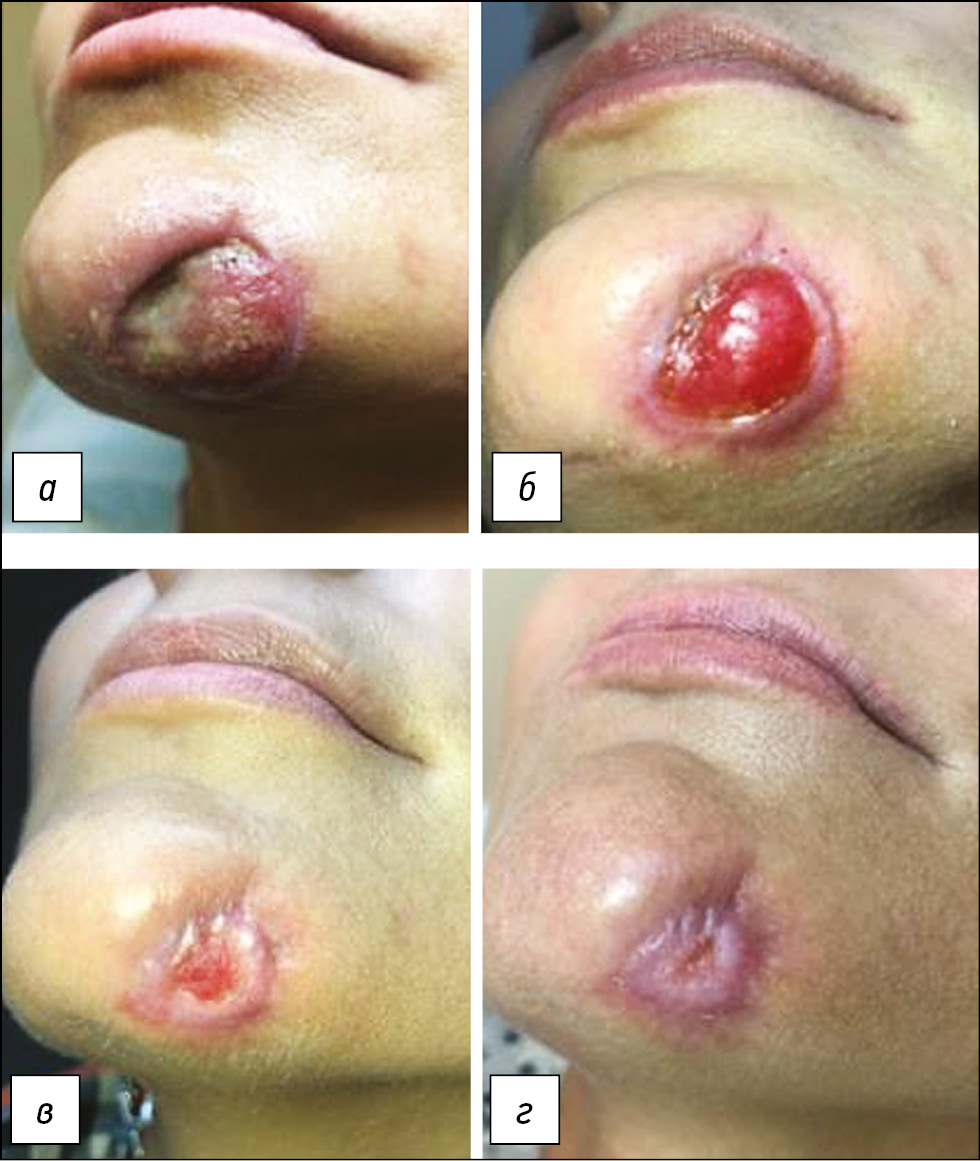 При осмотре: на коже подбородка глубокий язвенный дефект округлых очертаний с чёткими границами до 3,5 см в диаметре. Дно язвы неровное, представлено ярко-красными грануляциями, местами с наслоением гнойного отделяемого (рис. 10).